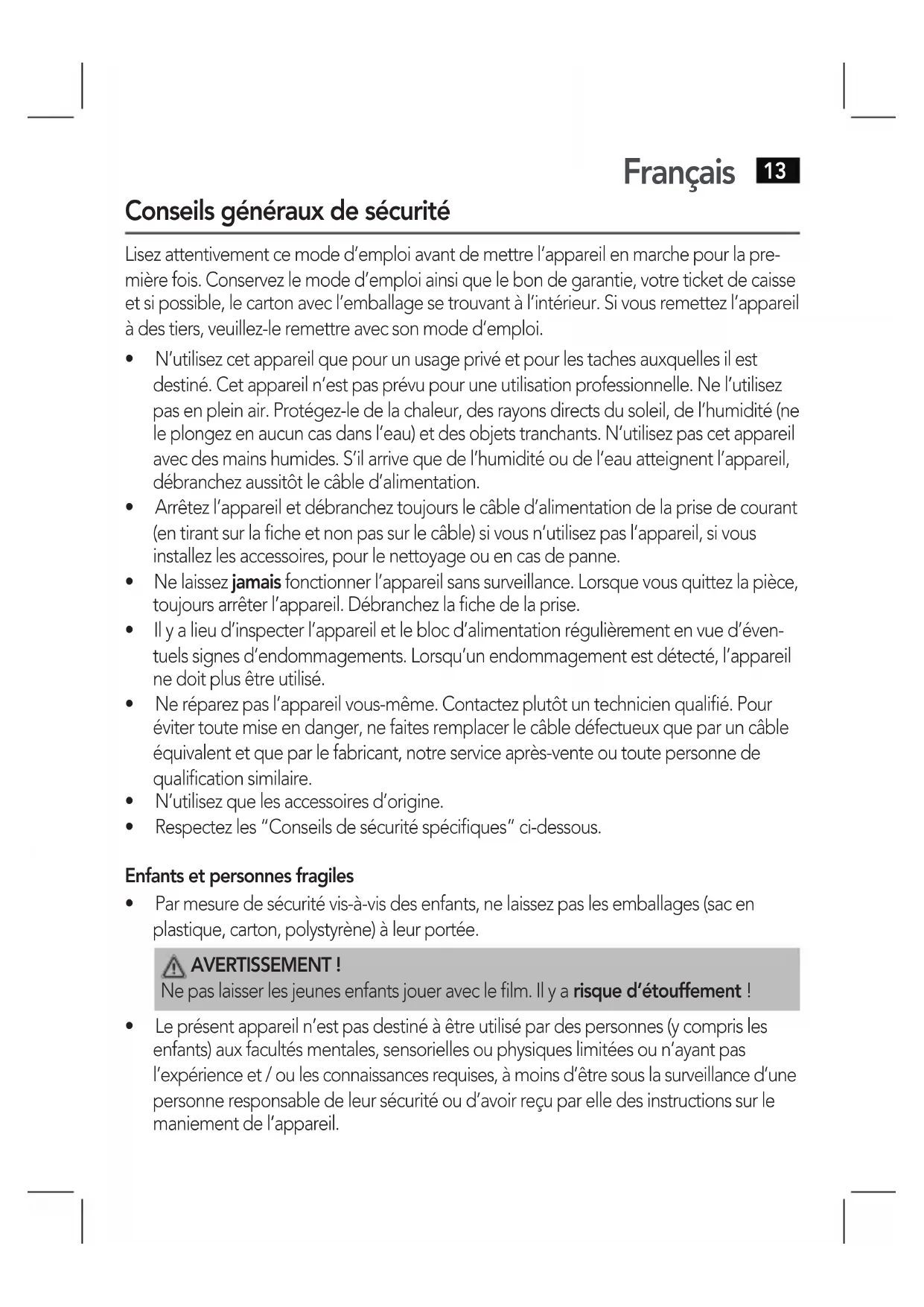 - Leprésentappareiln’estpasdestinéàêtreutilisépardespersonnes(ycomprisles enfants)auxfacultésmentales,sensoriellesouphysiqueslimitéesoun’ayantpas l’expérienceet/oulesconnaissancesrequises,àmoinsd’êtresouslasurveillanced’une personneresponsabledeleursécuritéoud’avoirreçuparelledesinstructionssurle maniement de l’appareil.Français