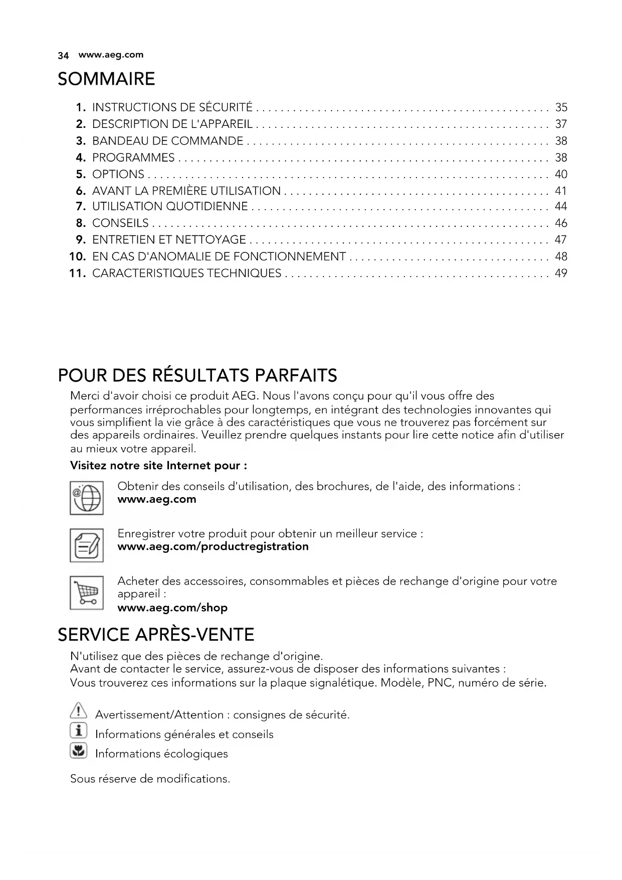 POUR DES RÉSULTATS PARFAITS Merci d'avoir choisi ce produit AEG. Nous l'avons conçu pour qu'il vous offre des