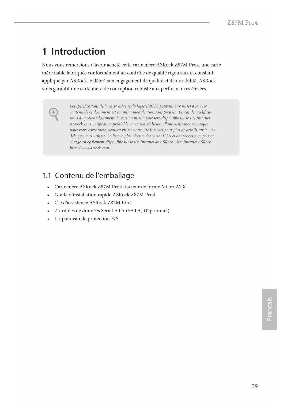 Nous vous remercions d’avoir acheté cette carte mère ASRock Z87M Pro4, une carte