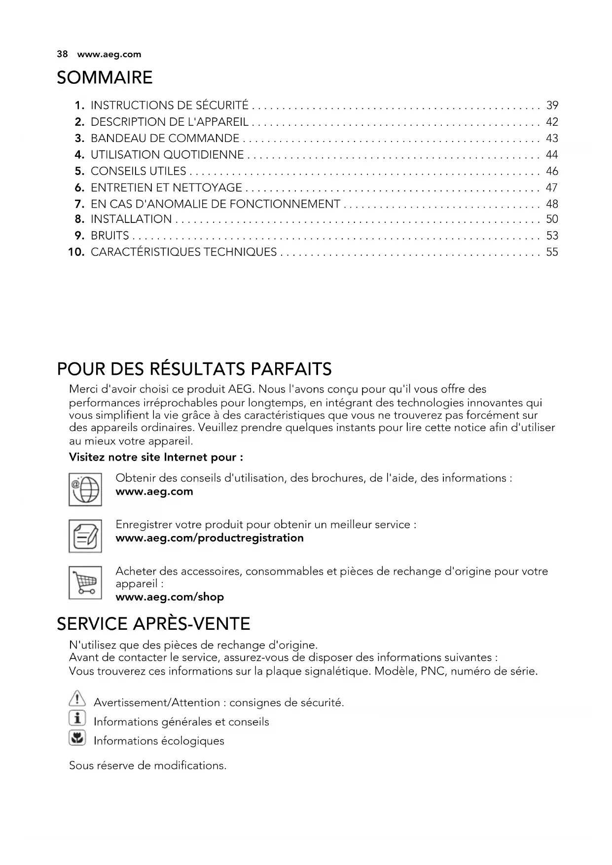 POUR DES RÉSULTATS PARFAITS Merci d'avoir choisi ce produit AEG. Nous l'avons conçu pour qu'il vous offre des