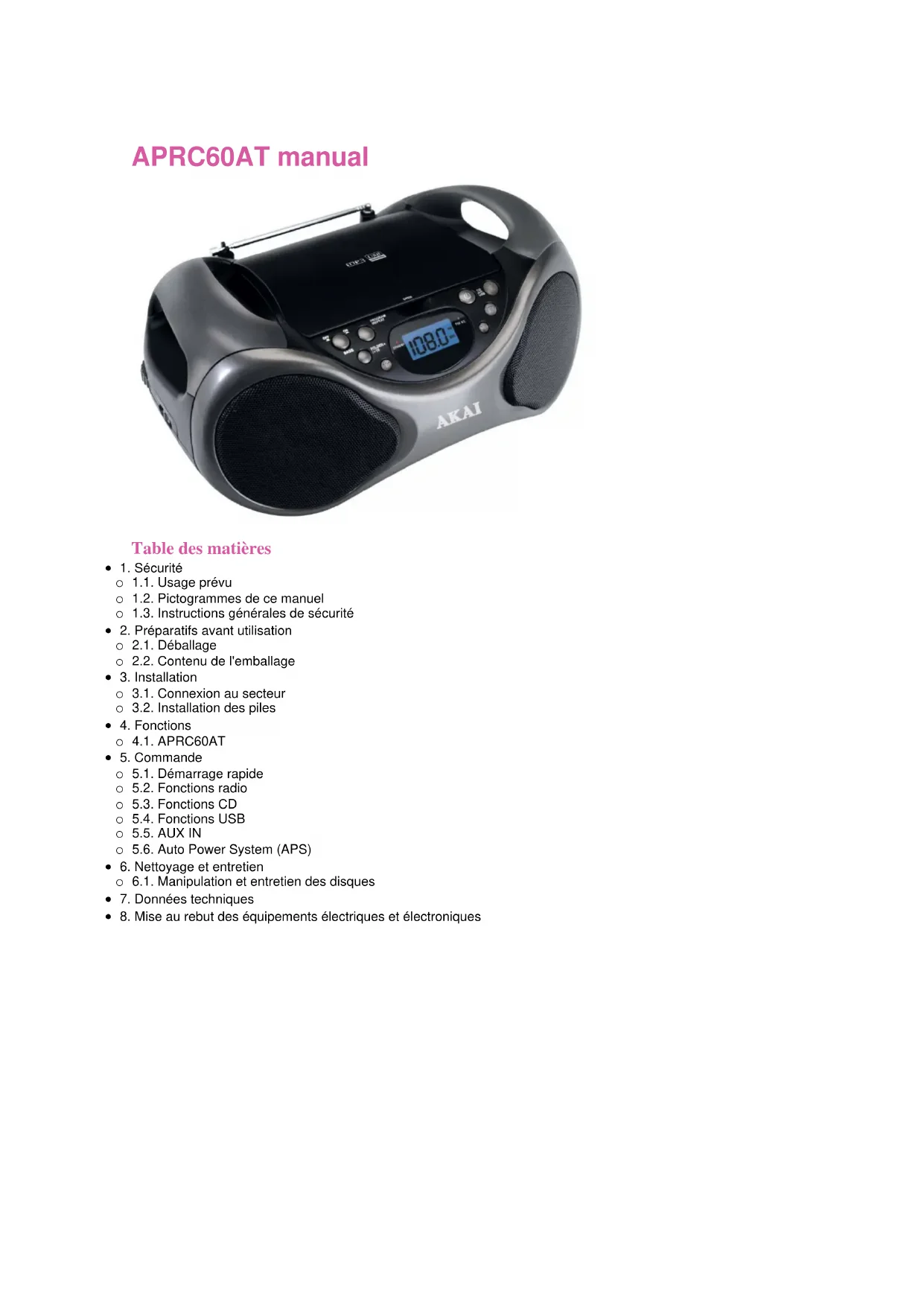 APRC60AT - Lecteur/enregistreur de cd AKAI - Notice d'utilisation et mode d'emploi gratuit