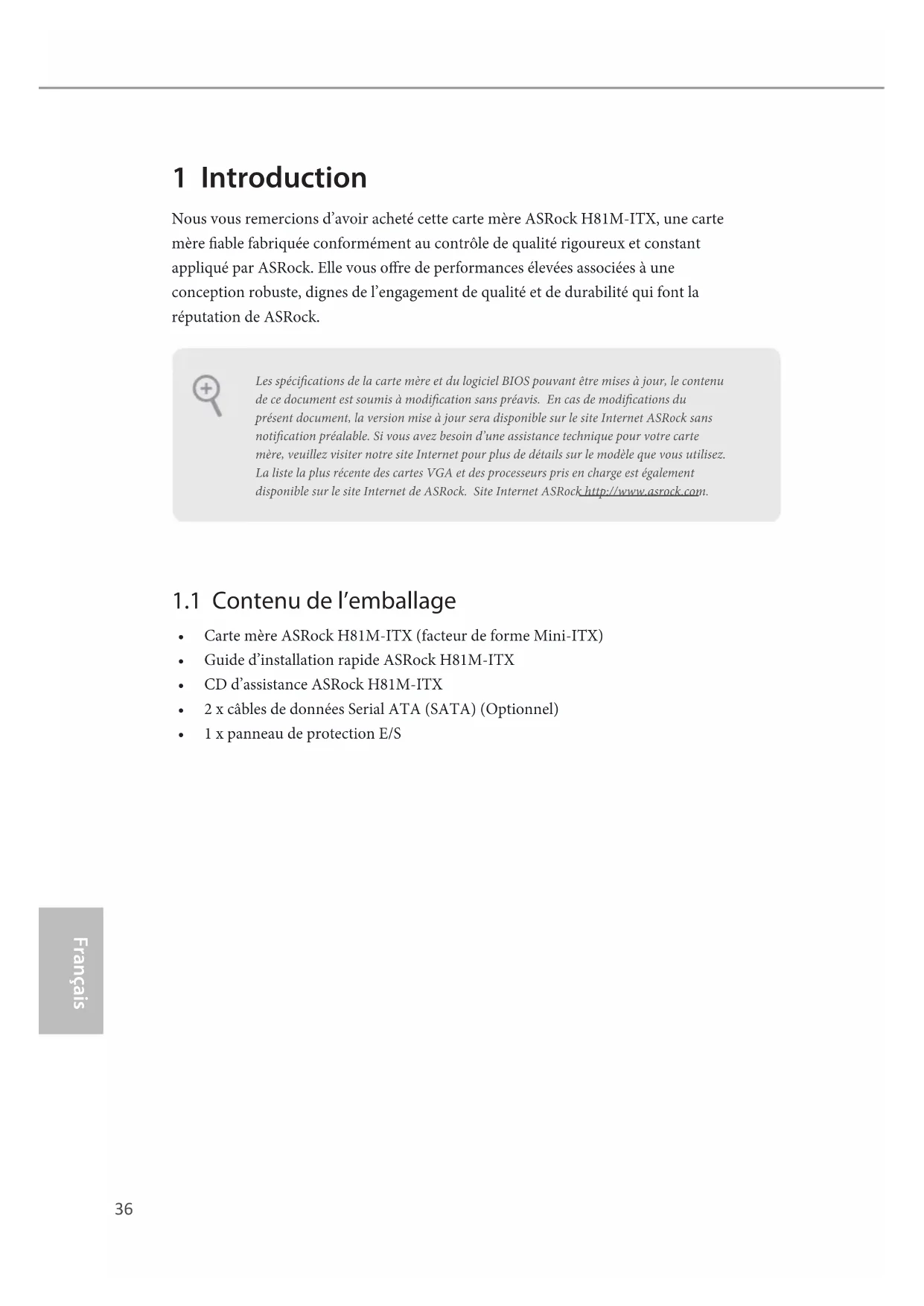 • 1 x panneau de protection E/S Les spécications de la carte mère et du logiciel BIOS pouvant être mises à jour, le contenu de ce document est soumis à modication sans préavis. En cas de modications du présent document, la version mise à jour sera disponible sur le site Internet ASRock sans notication préalable. Si vous avez besoin d’une assistance technique pour votre carte mère, veuillez visiter notre site Internet pour plus de détails sur le modèle que vous utilisez. La liste la plus récente des cartes VGA et des processeurs pris en charge est également disponible sur le site Internet de ASRock. Site Internet ASRock http://www.asrock.com.H81M-IT X