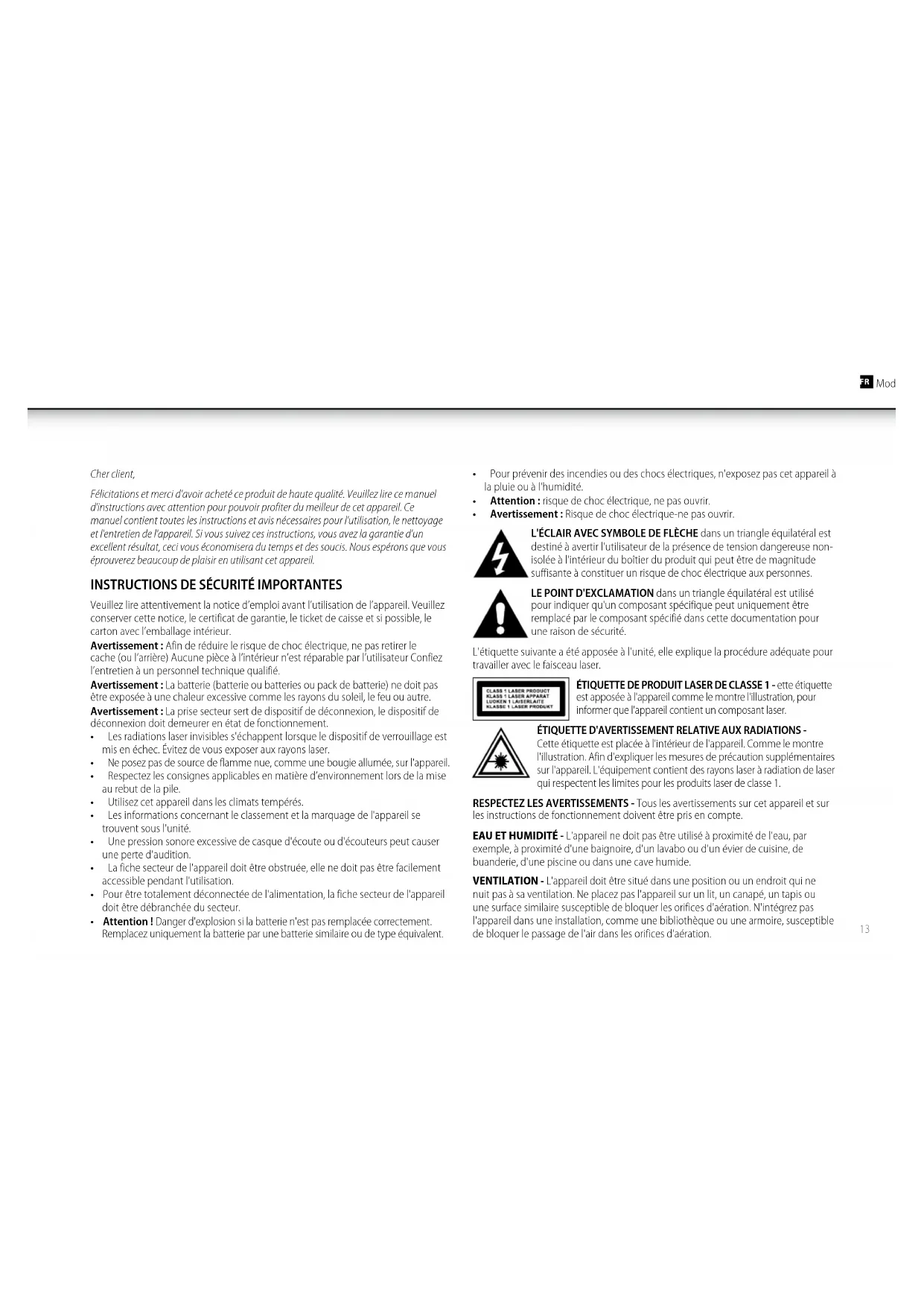 Cette étiquette est placée à l'intérieur de l'appareil. Comme le montre l'illustration. Afin d'expliquer les mesures de précaution supplémentaires sur l'appareil. L'équipement contient des rayons laser à radiation de laser qui respectent les limites pour les produits laser de classe 1. RESPECTEZ LES AVERTISSEMENTS - Tous les avertissements sur cet appareil et sur les instructions de fonctionnement doivent être pris en compte. EAU ET HUMIDITÉ - L'appareil ne doit pas être utilisé à proximité de l'eau, par exemple, à proximité d'une baignoire, d'un lavabo ou d'un évier de cuisine, de buanderie, d'une piscine ou dans une cave humide. VENTILATION - L'appareil doit être situé dans une position ou un endroit qui ne nuit pas à sa ventilation. Ne placez pas l'appareil sur un lit, un canapé, un tapis ou une surface similaire susceptible de bloquer les orifices d'aération. N'intégrez pas l'appareil dans une installation, comme une bibliothèque ou une armoire, susceptible de bloquer le passage de l'air dans les orifices d'aération.