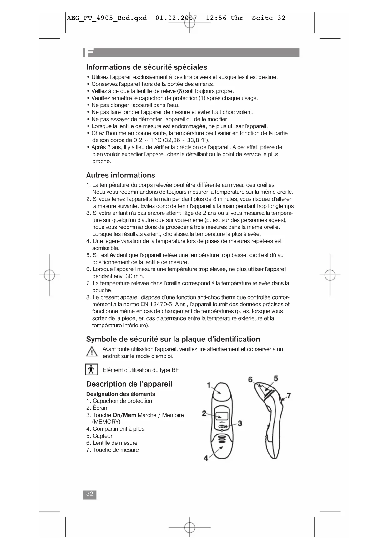 AEG_FT_4905_Bed.qxd 01.02.2007 12:56 Uhr Seite 34• Protéger l’appareil de mesure des rayons directs du soleil, de températures éle-