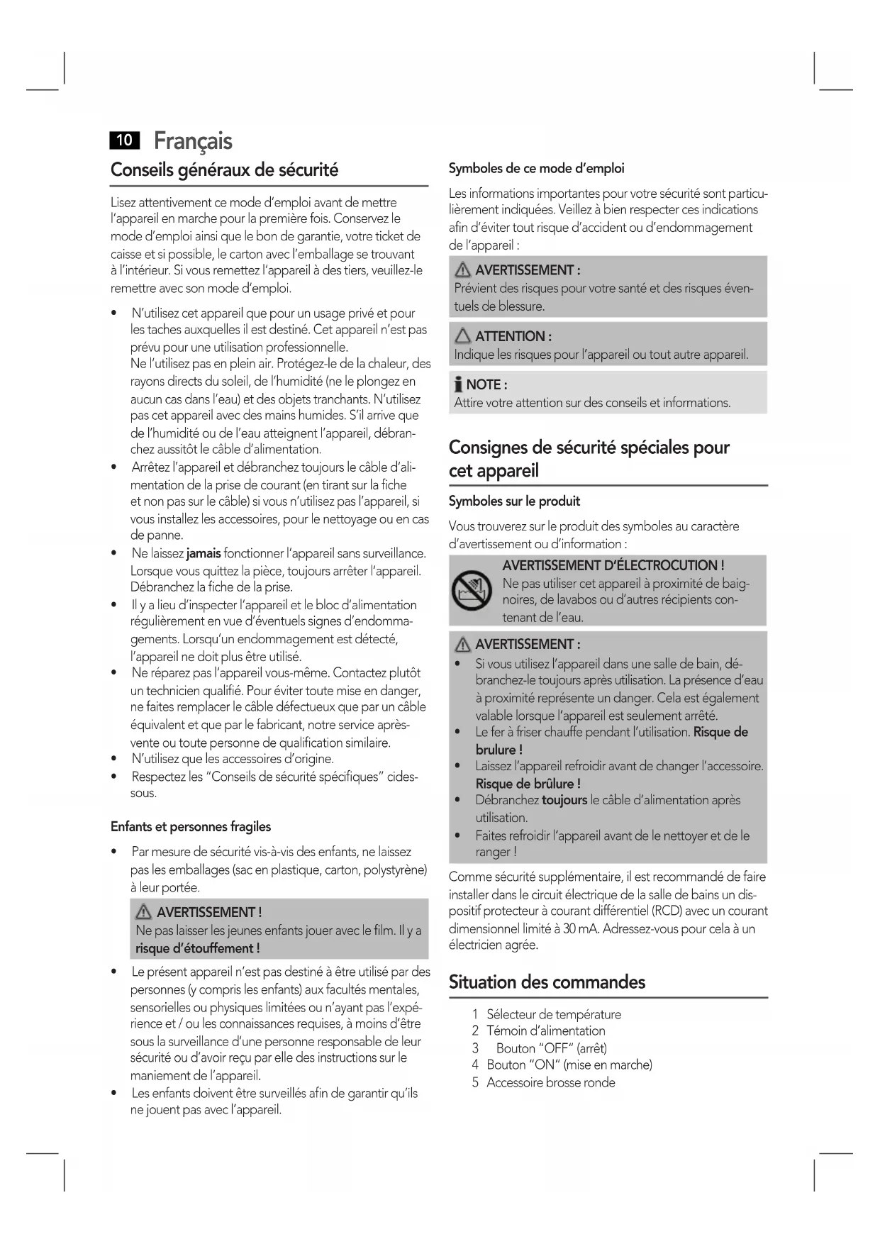 - Faitesrefroidirl‘appareilavantdelenettoyeretdele ranger ! Comme sécurité supplémentaire, il est recommandé de faire installer dans le circuit électrique de la salle de bains un dis- positif protecteur à courant différentiel (RCD) avec un courant dimensionnel limité à 30 mA. Adressez-vous pour cela à un électricien agrée. Situation des commandes 1 Sélecteur de température 2 Témoin d’alimentation 3 Bouton“OFF“(arrêt) 4 Bouton “ON“ (mise en marche) 5 Accessoire brosse rondeFrançais