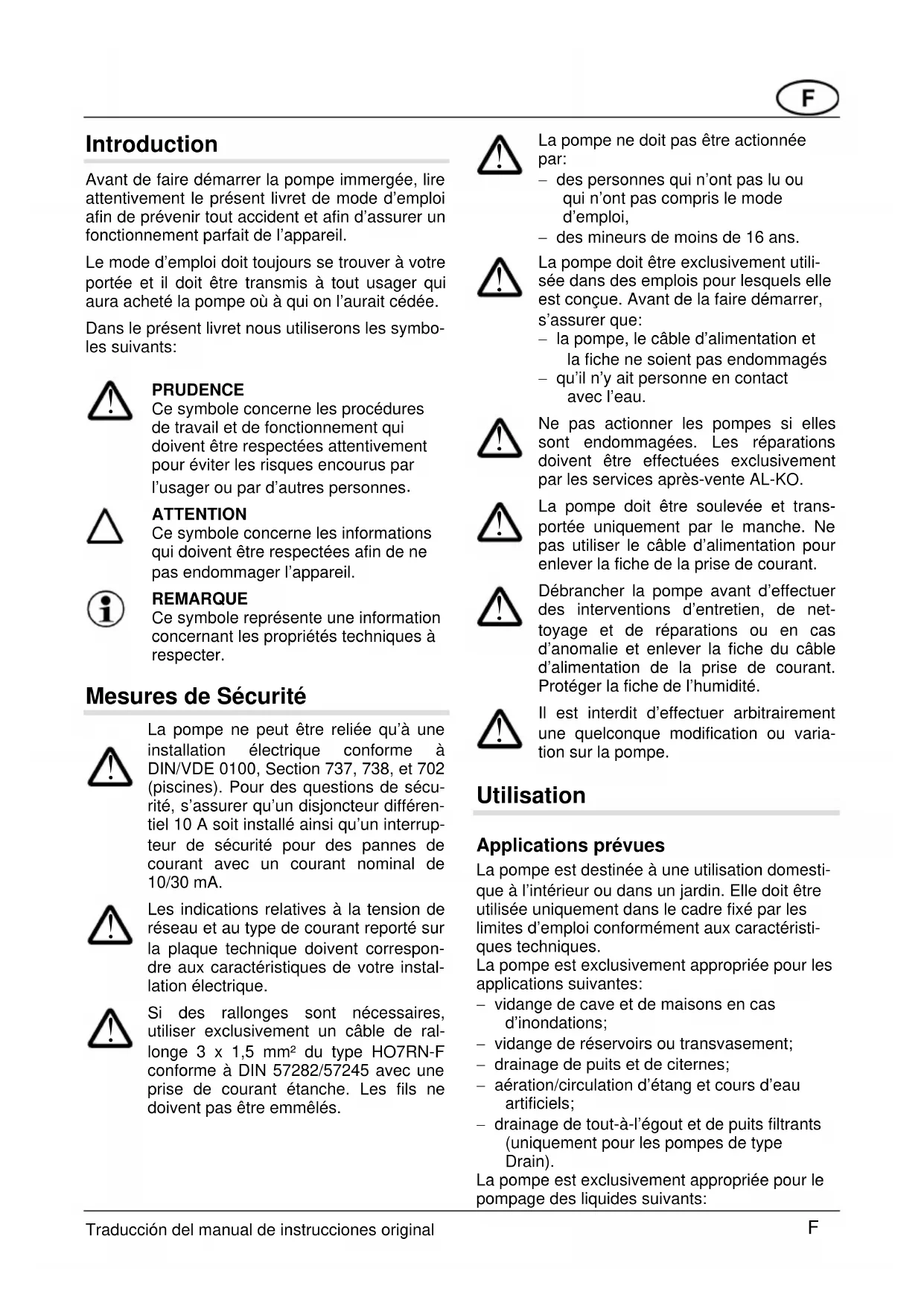 Pour éliminer d’éventuelles anomalies, avant toute opération, enlever la fiche de la prise de courant. Problème Cause Solution Le moteur ne tourne pas Turbine bloquée Eliminer l'obstruction en aspiration. L'interrupteur thermique s'est déconnecté Attendre que l'interrupteur thermique fasse redémarrer la pompe. Faire attention à la température maximum de l'eau. Faire vérifier la pompe. Manque de tension de réseau Faire vérifier l'alimentation électrique par un électricien spécialisé. L'interrupteur à flotteur n'inter- vient pas quand le niveau de l'eau augmente Expédier la pompe au Service Après- Vente AL-KO. La pompe tourne mais elle ne débite pas d'eau Présence d'air dans le corps de la pompe Faire sortir l'air en tenant la pompe sur une position oblique. Obstruction sur l'aspiration Eliminer les saletés sur l'aspiration. Ligne de refoulement fermée Ouvrir la ligne de refoulement. Tuyau de refoulement replié Détendre le tuyau de refoulement. Débit trop faible Diamètre du tuyau trop petit. Utiliser un tuyau de refoulement plus gros. Obstruction sur l’aspiration Eliminer les saletés sur l'aspiration. Hauteur d'élévation trop haute Diminuer la hauteur d'élévation. En cas d'anomalies persistantes, s'adresser au Centre Service Après-vente Clients AL-KO le plus proche. F 4 Traducción del manual de instrucciones originalIntroduzione Prima della messa in funzione della pompa sommersa, leggere attentamente il presente libretto di istruzioni al fine di prevenire incidenti ed assicurare un perfetto funzionamento. Le istruzioni devono essere tenute a portata di mano e devono essere cedute all'utente succes- sivo in caso di vendita o cedimento della pompa. Nel libretto di istruzioni viene usata la seguente simbologia: