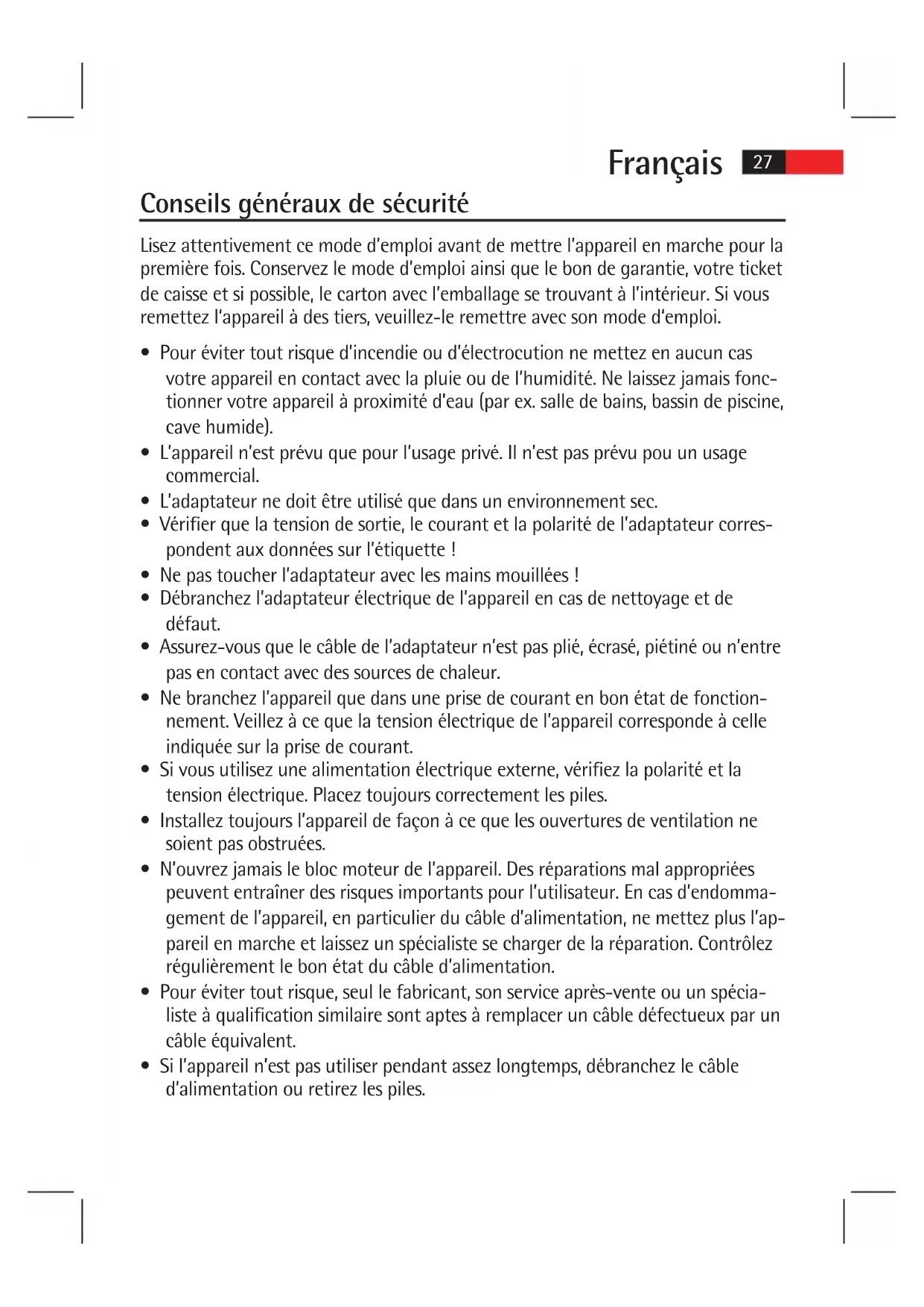 • L’appareil n’est prévu que pour l’usage privé. Il n’est pas prévu pou un usage