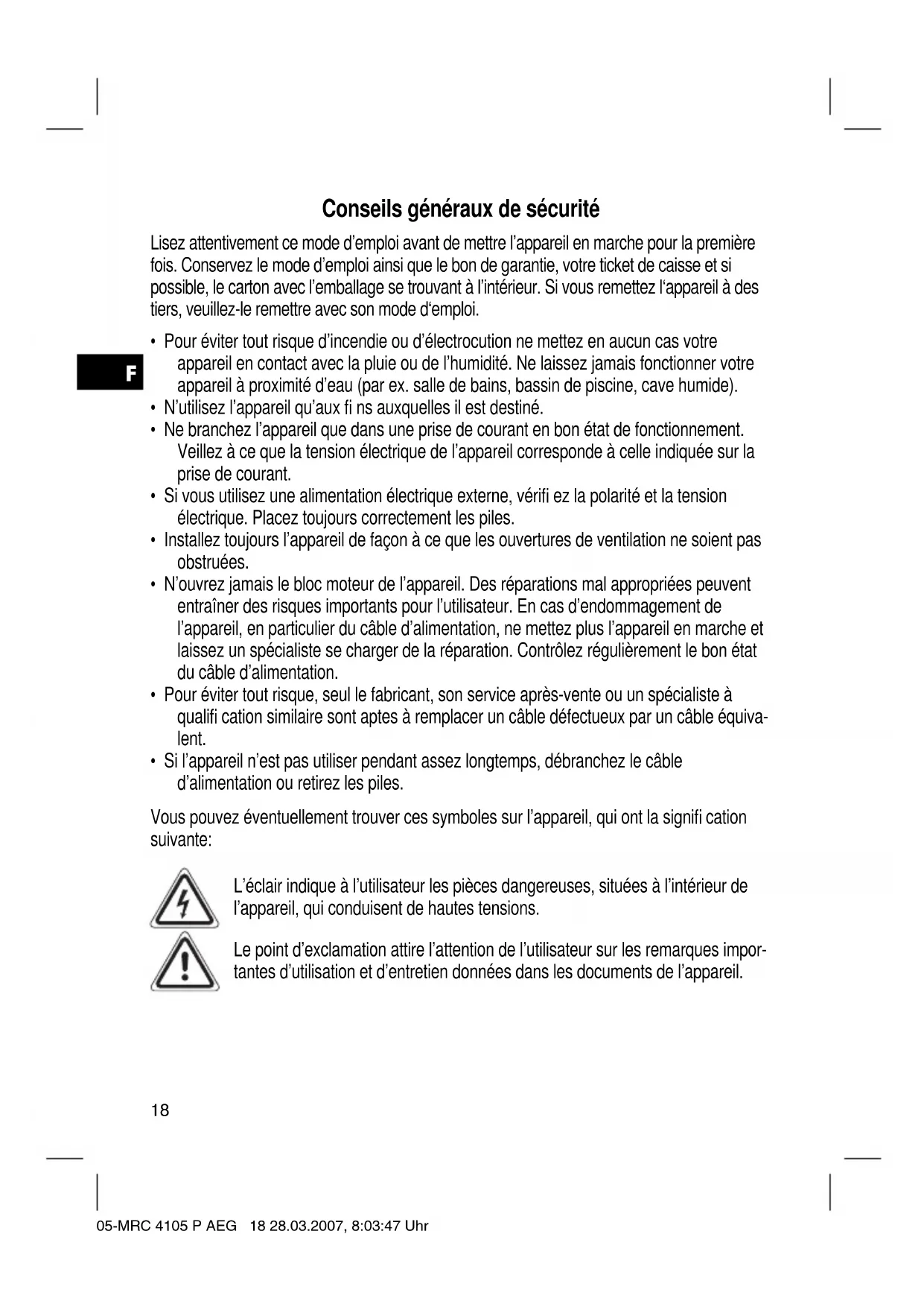 • Ne plongez jamais l’appareil dans l’eau. 05-MRC 4105 P AEG 22 28.03.2007, 8:03:51 UhrF