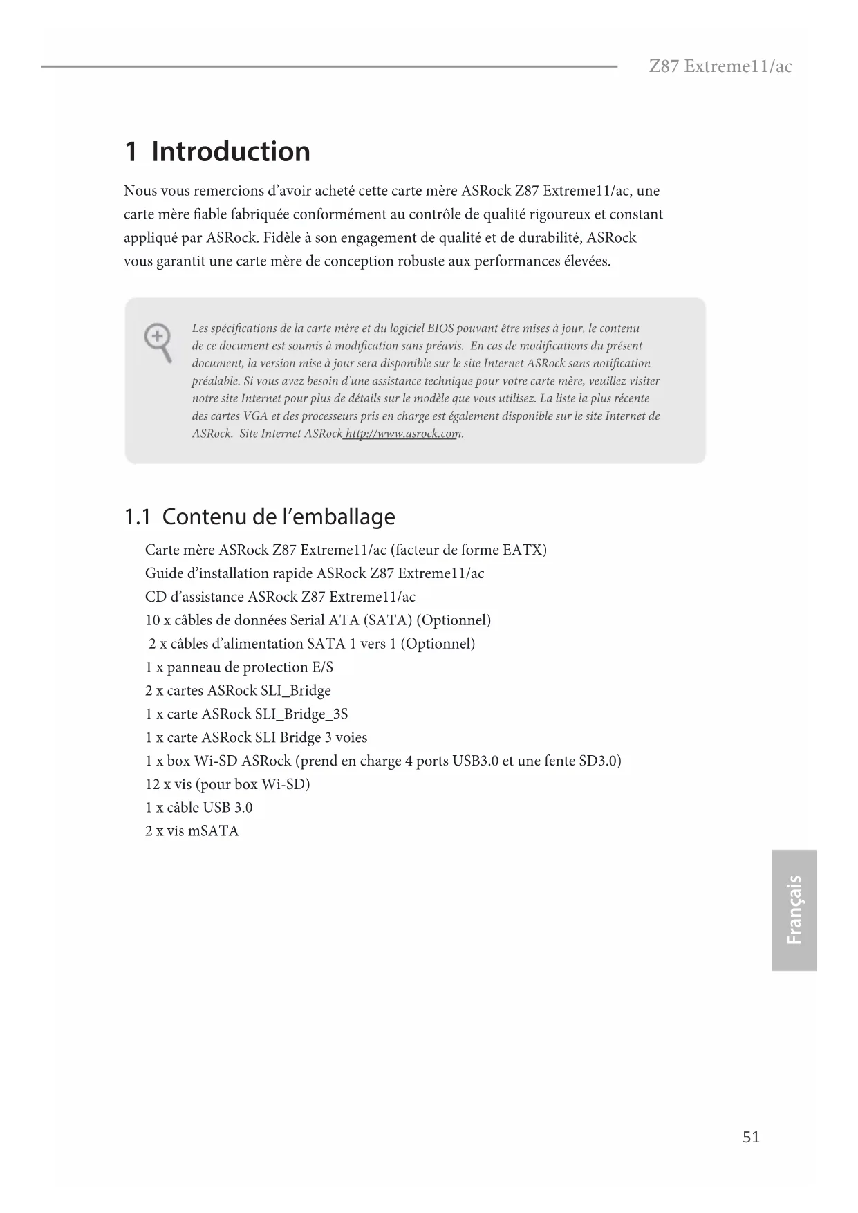 Nous vous remercions d’avoir acheté cette carte mère ASRock Z87 Extreme11/ac, une