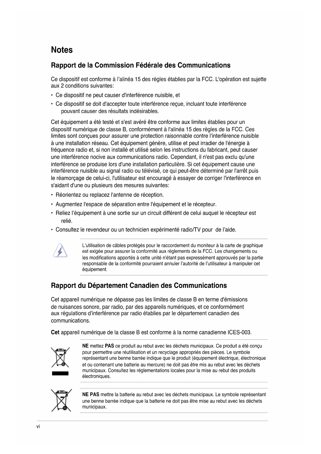 ASUS FOURNIT CE MANUEL “TEL QUE” SANS GARANTIE D’AUCUNE SORTE, QU’ELLE SOIT EXPRESSE OU IMPLICITE, COMPRENANT MAIS SANS Y ETRE LIMITE LES GARANTIES OU CONDITIONS DE COMMERCIALISATION OU D’APTITUDE POUR UN USAGE PARTICULIER. EN AUCUN CAS ASUS, SES DIRECTEURS, CADRES, EMPLOYES OU AGENTS NE POURRONT ÊTRE TENUS POUR RESPONSABLES POUR TOUT DOMMAGE INDIRECT, SPECIAL, SECONDAIRE OU CONSECUTIF (INCLUANT LES DOMMAGES POUR PERTE DE PROFIT, PERTE DE COMMERCE,