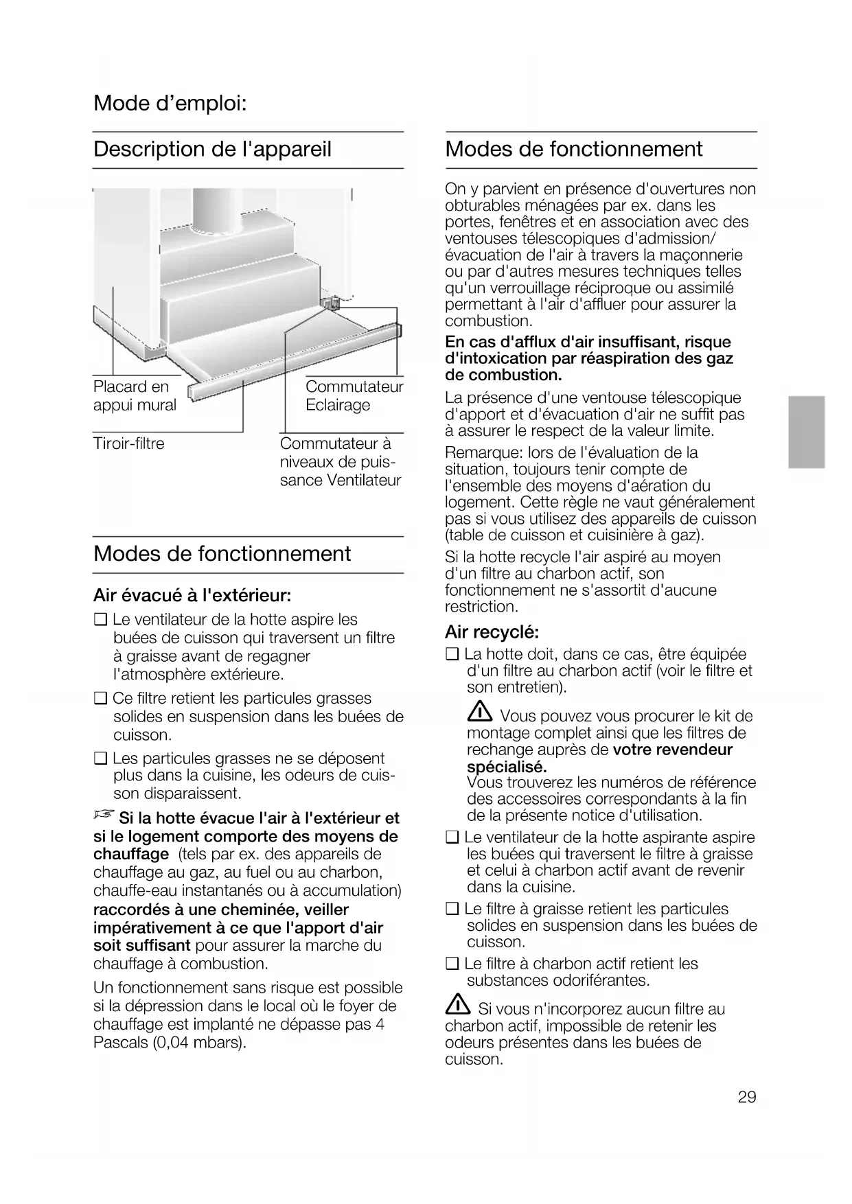 Si la hotte évacue l'air à l'extérieur et si le logement comporte des moyens de chauffage (tels par ex. des appareils de chauffage au gaz, au fuel ou au charbon, chauffe-eau instantanés ou à accumulation) raccordés à une cheminée, veiller impérativement à ce que l'apport d'air soit suffisant pour assurer la marche du chauffage à combustion. Un fonctionnement sans risque est possible si la dépression dans le local où le foyer de chauffage est implanté ne dépasse pas 4 Pascals (0,04 mbars). Modes de fonctionnement On y parvient en présence d'ouvertures non obturables ménagées par ex. dans les portes, fenêtres et en association avec des ventouses télescopiques d'admission/ évacuation de l'air à travers la maçonnerie ou par d'autres mesures techniques telles qu'un verrouillage réciproque ou assimilé permettant à l'air d'affluer pour assurer la combustion. En cas d'afflux d'air insuffisant, risque d'intoxication par réaspiration des gaz de combustion. La présence d'une ventouse télescopique d'apport et d'évacuation d'air ne suffit pas à assurer le respect de la valeur limite. Remarque: lors de l'évaluation de la situation, toujours tenir compte de l'ensemble des moyens d'aération du logement. Cette règle ne vaut généralement pas si vous utilisez des appareils de cuisson (table de cuisson et cuisinière à gaz). Si la hotte recycle l'air aspiré au moyen d'un filtre au charbon actif, son fonctionnement ne s'assortit d'aucune restriction. Air recyclé: ❑ La hotte doit, dans ce cas, être équipée d'un filtre au charbon actif (voir le filtre et son entretien). Vous pouvez vous procurer le kit de montage complet ainsi que les filtres de rechange auprès de votre revendeur spécialisé. Vous trouverez les numéros de référence des accessoires correspondants à la fin de la présente notice d'utilisation. ❑ Le ventilateur de la hotte aspirante aspire les buées qui traversent le filtre à graisse et celui à charbon actif avant de revenir dans la cuisine. ❑ Le filtre à graisse retient les particules solides en suspension dans les buées de cuisson. ❑ Le filtre à charbon actif retient les substances odoriférantes. Si vous n'incorporez aucun filtre au charbon actif, impossible de retenir les odeurs présentes dans les buées de cuisson. Mode d’emploi: Commutateur à niveaux de puis- sance Ventilateur Placard en appui mural Tiroir-filtre Commutateur Eclairage30 Avant la première utilisation Remarques importantes: ❑ La présente notice d'emploi vaut pourplusieurs versions de l'appareil. Elle peut contenir des descriptions d'accessoires ne figurant pas dans votreappareil.❑ Cette hotte aspirante est conforme aux dispositions de sécurité applicables.Les réparations ne doivent être effectuées que par un spécialiste.Des réparations inexpertes s'assortissent de risques considérables pour l'utilisateur. Ne flambez aucun mets sous la hotte. Les flammes risqueraient d'atteindre le ! filtre à graisse et d'y mettre le feu. L'utilisation d'une hotte aspirante au-dessus d'un foyer à combustible solide(charbon, bois, etc.) n'est autorisée qu'àcertaines conditions (voir la notice de montage).Table de cuisson au gaz / Cuisinières à gaz Utilisez toujours les foyers au gaz correctement.Important:Les flammes produites par les foyers augaz doivent toujours être recouvertes par lavaisselle de cuisson.Dans le cas contraire, la hotte aspirantepourrait être endommagée par la chaleur intense dégagée par les flammes nues ! du foyer. ❑ Lisez attentivement la présente noticed'emploi avant d'utiliser votre appareilpour la première fois. Elle contient desinformations importantes non seulementpour votre sécurité mais aussi pour l'utilisation et l'entretien de l'appareil.❑ Rangez la présente notice de montageet d'emploi soigneusement pour pouvoirla remettre à un futur propriétaire de l'appareil. Si l'appareil est endommagé, sa mise en service est proscrite. Le branchement et la mise en service ne doivent être effectués que par un spécialiste. Si le cordon d'alimentation de cet appareil a été endommagé, il faut confierson remplacement au fabricant ou à sonservice après-vente, ou encore à une personne possédant des qualificationsidentiques, pour éviter de créer desrisques. Eliminez les matériaux d'emballage conformément à la réglementation (voir lanotice de montage). Ne faites marcher la hotte aspirante qu'ampoules montées sur leur douille. Remplacez immédiatement les ampoules défectueuses pour empêcherune surcharge des ampoules restantes. N'utilisez jamais la hotte aspirante sans filtre à graisse. Les graisses ou huiles surchauffées peuvent s'enflammer facilement.Par conséquent, surveillez toujours les plats(frites par ex.) qui se préparent à l'aide dematières grasses ou d'huiles.31 La méthode la plus efficace pour supprimer les buées de cuisson consiste à: Enclencher le ventilateuren début de cuisson. Eteindre le ventilateur quelques minutes après la fin de la cuisson.Enclenchement du ventilateur: Tirez le tiroir-filtre par sa poignée.❑ Le ventilateur se met en marche. Réglez le ventilateur sur la vitessedésirée.Eléments de commande des différentsmodèles:Utilisation de la hotte aspiranteEclairage:Remarque: vous pouvez utiliser l'éclairageà tout moment, même si le tiroir-filtre estrentré.