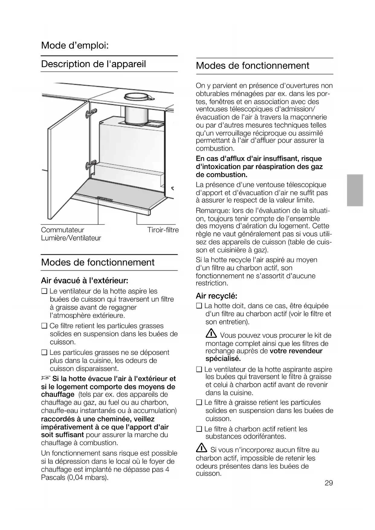 Screw in the left and right fixing screws until the lugs are pressed out at the sides. Removal from the wall cupboard29 Modes de fonctionnement On y parvient en présence d'ouvertures non obturables ménagées par ex. dans les por- tes, fenêtres et en association avec des ventouses télescopiques d'admission/ évacuation de l'air à travers la maçonnerie ou par d'autres mesures techniques telles qu'un verrouillage réciproque ou assimilé permettant à l'air d'affluer pour assurer la combustion. En cas d'afflux d'air insuffisant, risque d'intoxication par réaspiration des gaz de combustion. La présence d'une ventouse télescopique d'apport et d'évacuation d'air ne suffit pas à assurer le respect de la valeur limite. Remarque: lors de l'évaluation de la situati- on, toujours tenir compte de l'ensemble des moyens d'aération du logement. Cette règle ne vaut généralement pas si vous utili- sez des appareils de cuisson (table de cuis- son et cuisinière à gaz). Si la hotte recycle l'air aspiré au moyen d'un filtre au charbon actif, son fonctionnement ne s'assortit d'aucune restriction. Air recyclé: ❑ La hotte doit, dans ce cas, être équipée d'un filtre au charbon actif (voir le filtre et son entretien). Vous pouvez vous procurer le kit de montage complet ainsi que les filtres de rechange auprès de votre revendeur spécialisé. ❑ Le ventilateur de la hotte aspirante aspire les buées qui traversent le filtre à graisse et celui à charbon actif avant de revenir dans la cuisine. ❑ Le filtre à graisse retient les particules solides en suspension dans les buées de cuisson. ❑ Le filtre à charbon actif retient les substances odoriférantes. Si vous n'incorporez aucun filtre au charbon actif, impossible de retenir les odeurs présentes dans les buées de cuisson. Commutateur Lumière/Ventilateur Tiroir-filtre Description de l'appareil Mode d’emploi: Modes de fonctionnement Air évacué à l'extérieur: ❑ Le ventilateur de la hotte aspire les buées de cuisson qui traversent un filtre à graisse avant de regagner l'atmosphère extérieure. ❑ Ce filtre retient les particules grasses solides en suspension dans les buées de cuisson. ❑ Les particules grasses ne se déposent plus dans la cuisine, les odeurs de cuisson disparaissent.