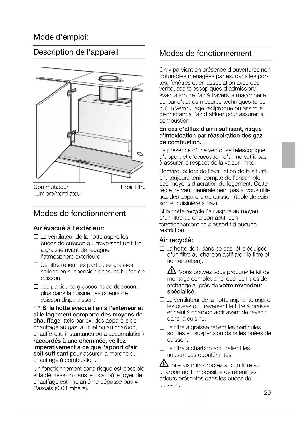 The earthed socket should be connected via its own power circuit. If appliances do not feature the OFF delay function, the indicator may start flas- hing when the extractor hood has been switched off for several hours via a separa- te switch, even though the grease filters are not yet saturated. (See instructions for use, section on filter and maintenance). Electrical specifications: These can be found on the rating plate inside the appliance following removal of the filter frames. Before carrying out repairs, always isolate the appliance. Length of the connection cable: 1.30 m. If permanent connection is required: The extractor hood may only be connected by an electrician registered with the local electricity board. A disconnecting device must be provided on the installation side. Switches with a contact opening of more than 3 mm and all-pole disconnection are regarded as disconnecting devices. These include LS switches and contactors. This extractor hood complies with EU regulations on interference suppression. Removal from the wall cupboard29 Modes de fonctionnement On y parvient en présence d'ouvertures non obturables ménagées par ex. dans les por- tes, fenêtres et en association avec des ventouses télescopiques d'admission/ évacuation de l'air à travers la maçonnerie ou par d'autres mesures techniques telles qu'un verrouillage réciproque ou assimilé permettant à l'air d'affluer pour assurer la combustion. En cas d'afflux d'air insuffisant, risque d'intoxication par réaspiration des gaz de combustion. La présence d'une ventouse télescopique d'apport et d'évacuation d'air ne suffit pas à assurer le respect de la valeur limite. Remarque: lors de l'évaluation de la situati- on, toujours tenir compte de l'ensemble des moyens d'aération du logement. Cette règle ne vaut généralement pas si vous utili- sez des appareils de cuisson (table de cuis- son et cuisinière à gaz). Si la hotte recycle l'air aspiré au moyen d'un filtre au charbon actif, son fonctionnement ne s'assortit d'aucune restriction. Air recyclé: ❑ La hotte doit, dans ce cas, être équipée d'un filtre au charbon actif (voir le filtre et son entretien). Vous pouvez vous procurer le kit de montage complet ainsi que les filtres de rechange auprès de votre revendeur spécialisé. ❑ Le ventilateur de la hotte aspirante aspire les buées qui traversent le filtre à graisse et celui à charbon actif avant de revenir dans la cuisine. ❑ Le filtre à graisse retient les particules solides en suspension dans les buées de cuisson. ❑ Le filtre à charbon actif retient les substances odoriférantes. Si vous n'incorporez aucun filtre au charbon actif, impossible de retenir les odeurs présentes dans les buées de cuisson. Commutateur Lumière/Ventilateur Tiroir-filtre Description de l'appareil Mode d’emploi: Modes de fonctionnement Air évacué à l'extérieur: ❑ Le ventilateur de la hotte aspire les buées de cuisson qui traversent un filtre à graisse avant de regagner l'atmosphère extérieure. ❑ Ce filtre retient les particules grasses solides en suspension dans les buées de cuisson. ❑ Les particules grasses ne se déposent plus dans la cuisine, les odeurs de cuisson disparaissent.