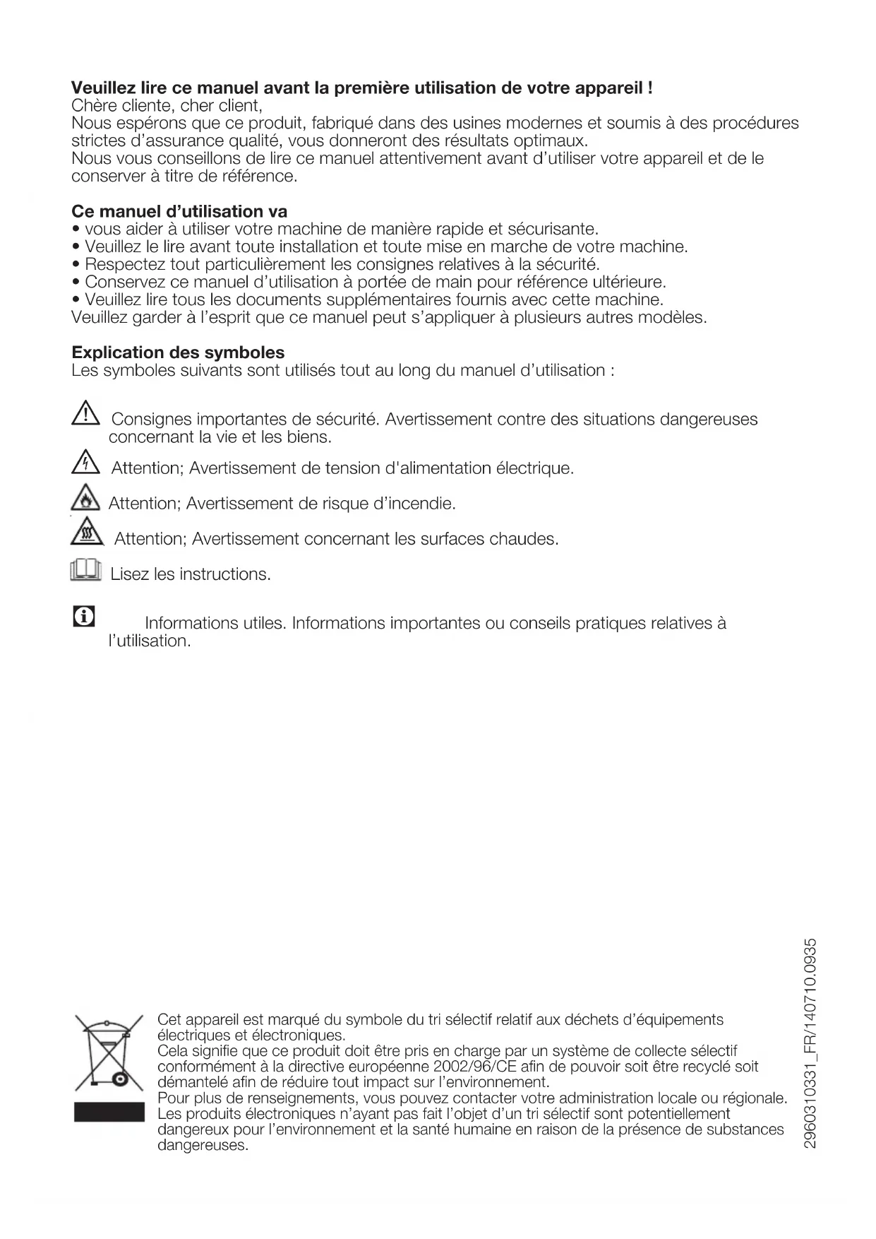 • Veuillez le lire avant toute installation et toute mise en marche de votre machine.