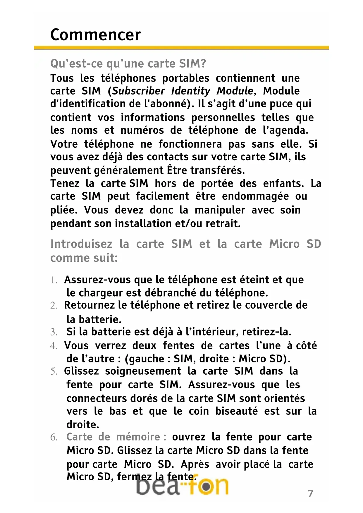 - Bea-fon Mobile GmbH ne doit porter aucune responsabilité pour chaque cause que ce soit, de traumatisme indirect, accidentel, fortuit ou inévitable causé par l'utilisation de ce produit, y compris toute blessures considérées, ou non comme susceptible de se produit.