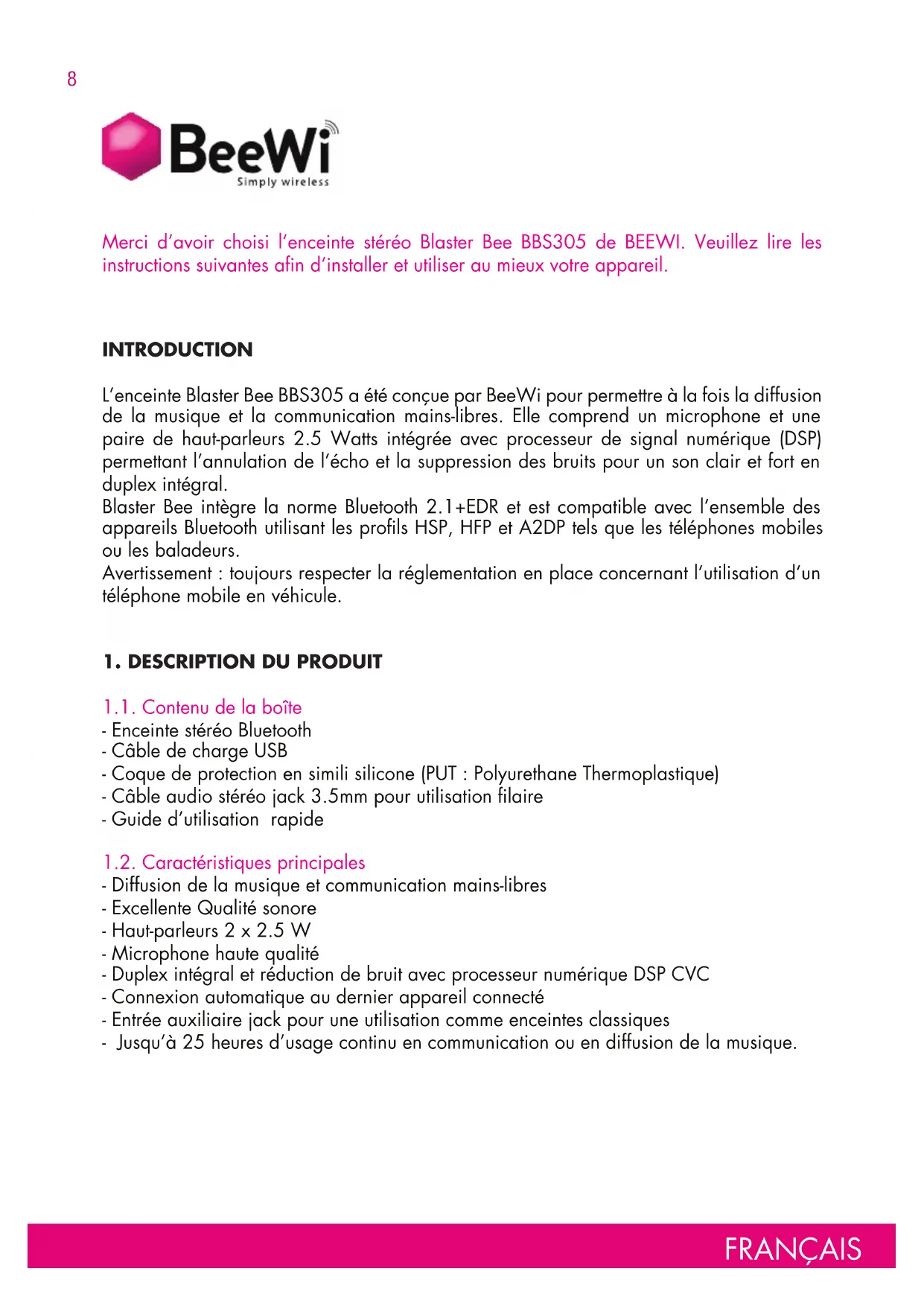 1.1. Contenu de la boîte - Enceinte stéréo Bluetooth - Câble de charge USB - Coque de protection en simili silicone (PUT : Polyurethane Thermoplastique) - Câble audio stéréo jack 3.5mm pour utilisation filaire - Guide d’utilisation rapide 1.2. Caractéristiques principales - Diffusion de la musique et communication mains-libres - Excellente Qualité sonore - Haut-parleurs 2 x 2.5 W - Microphone haute qualité - Duplex intégral et réduction de bruit avec processeur numérique DSP CVC - Connexion automatique au dernier appareil connecté - Entrée auxiliaire jack pour une utilisation comme enceintes classiques - Jusqu’à 25 heures d’usage continu en communication ou en diffusion de la musique. Merci d’avoir choisi l’enceinte stéréo Blaster Bee BBS305 de BEEWI. Veuillez lire les instructions suivantes afin d’installer et utiliser au mieux votre appareil.9 FRANÇAIS 1.3. Présentation du produit On/Off: commutateur marche/arrêt Connecteur de charge (compatible micro USB) Connecteur Jack 3.5mm : entrée jack auxiliaire Touche multifonction, marche et pause de la musique, prise d’appel, mise en appairage indicateur lumineux Touche de contrôle des pistes & Touche de contrôle de volume VOL /VOL microphone 1.4. Caractéristiques produit