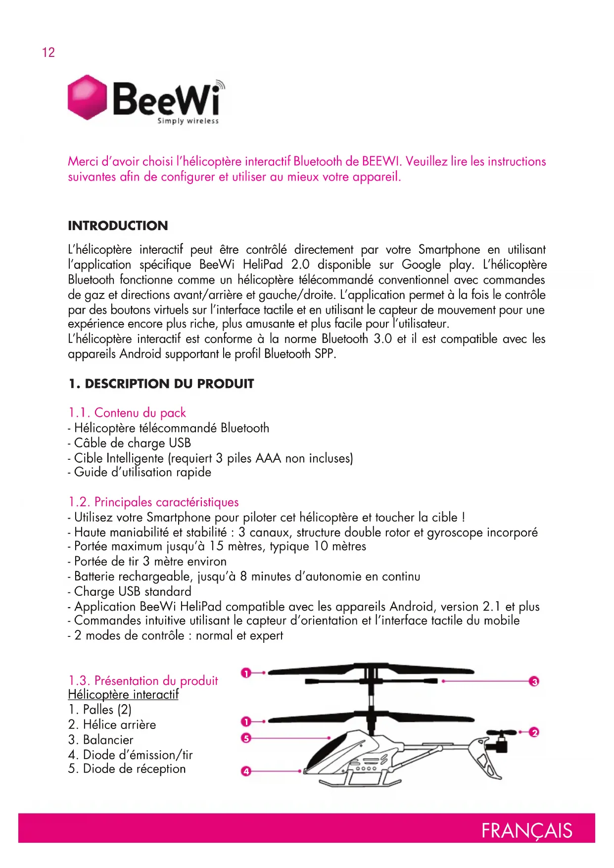 1.1. Contenu du pack - Hélicoptère télécommandé Bluetooth - Câble de charge USB - Cible Intelligente (requiert 3 piles AAA non incluses) - Guide d’utilisation rapide 1.2. Principales caractéristiques - Utilisez votre Smartphone pour piloter cet hélicoptère et toucher la cible ! - Haute maniabilité et stabilité : 3 canaux, structure double rotor et gyroscope incorporé - Portée maximum jusqu’à 15 mètres, typique 10 mètres - Portée de tir 3 mètre environ - Batterie rechargeable, jusqu’à 8 minutes d’autonomie en continu - Charge USB standard - Application BeeWi HeliPad compatible avec les appareils Android, version 2.1 et plus - Commandes intuitive utilisant le capteur d’orientation et l’interface tactile du mobile - 2 modes de contrôle : normal et expert 1.3. Présentation du produit Hélicoptère interactif