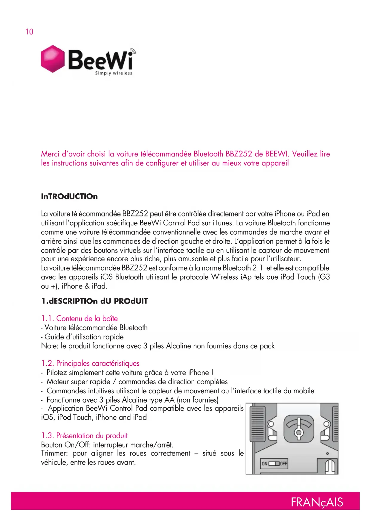 are trademarks of Apple Inc. registered in the U.S. and other countries. BEEWI is a registered trademark. Other trademarks mentioned herewith are owned by their proprietors. All other product or service names are the property of their respective owners. The use of wireless devices and their accessories may be prohibited or restricted in certain areas. Always obey the laws and regulations on the use of these products. This product is covered by a 2-year product warranty which is valid from the date of purchase. Users are not permitted to make changes or modify the device in any way. Changes or modifications not expressly approved by the party responsible for compliance will void the user’s warranty. Please visit our website www.bee-wi.com for more information. Technical support: support@bee-wi.com. © VOXLAND Les Rizeries 208 Bld de Plombières CS90234 13311 Marseille Cedex 14 France.10 FRANçAIS InTROdUCTIOn La voiture télécommandée BBZ252 peut être contrôlée directement par votre iPhone ou iPad en utilisant l’application spécifique BeeWi Control Pad sur iTunes. La voiture Bluetooth fonctionne comme une voiture télécommandée conventionnelle avec les commandes de marche avant et arrière ainsi que les commandes de direction gauche et droite. L’application permet à la fois le contrôle par des boutons virtuels sur l’interface tactile ou en utilisant le capteur de mouvement pour une expérience encore plus riche, plus amusante et plus facile pour l’utilisateur. La voiture télécommandée BBZ252 est conforme à la norme Bluetooth 2.1 et elle est compatible avec les appareils iOS Bluetooth utilisant le protocole Wireless iAp tels que iPod Touch (G3 ou +), iPhone & iPad. 1.dESCRIPTIOn dU PROdUIT 1.1. Contenu de la boîte - Voiture télécommandée Bluetooth - Guide d’utilisation rapide Note: le produit fonctionne avec 3 piles Alcaline non fournies dans ce pack 1.2. Principales caractéristiques - Pilotez simplement cette voiture grâce à votre iPhone ! - Moteur super rapide / commandes de direction complètes - Commandes intuitives utilisant le capteur de mouvement ou l’interface tactile du mobile - Fonctionne avec 3 piles Alcaline type AA (non fournies) - Application BeeWi Control Pad compatible avec les appareils iOS, iPod Touch, iPhone and iPad 1.3. Présentation du produit Bouton On/Off: interrupteur marche/arrêt. Trimmer: pour aligner les roues correctement – situé sous le véhicule, entre les roues avant. Merci d’avoir choisi la voiture télécommandée Bluetooth BBZ252 de BEEWI. Veuillez lire les instructions suivantes afin de configurer et utiliser au mieux votre appareil11 FRANçAIS 1.4. Spécifications