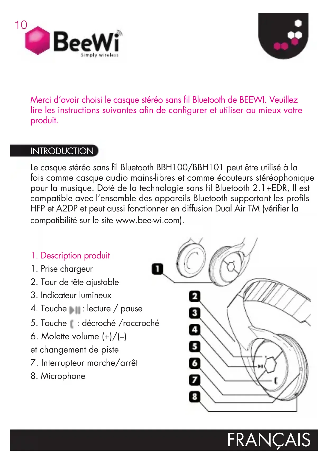 INTRODUCTION Merci d’avoir choisi le casque stéréo sans l Bluetooth de BEEWI. Veuillez lire les instructions suivantes afin de configurer et utiliser au mieux votre produit. FRANÇAIS11