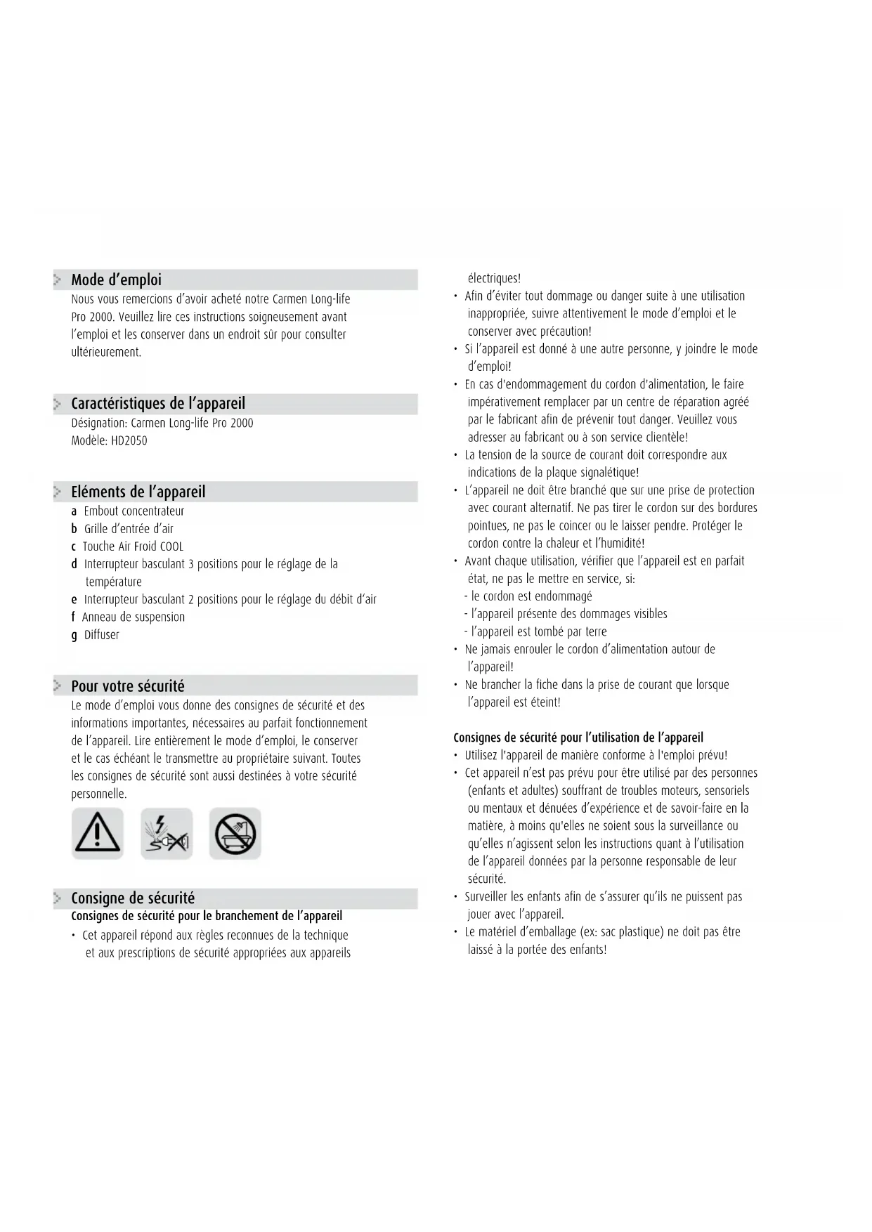 HD2050 - Sèche cheveux Carmen - Notice d'utilisation et mode d'emploi gratuit