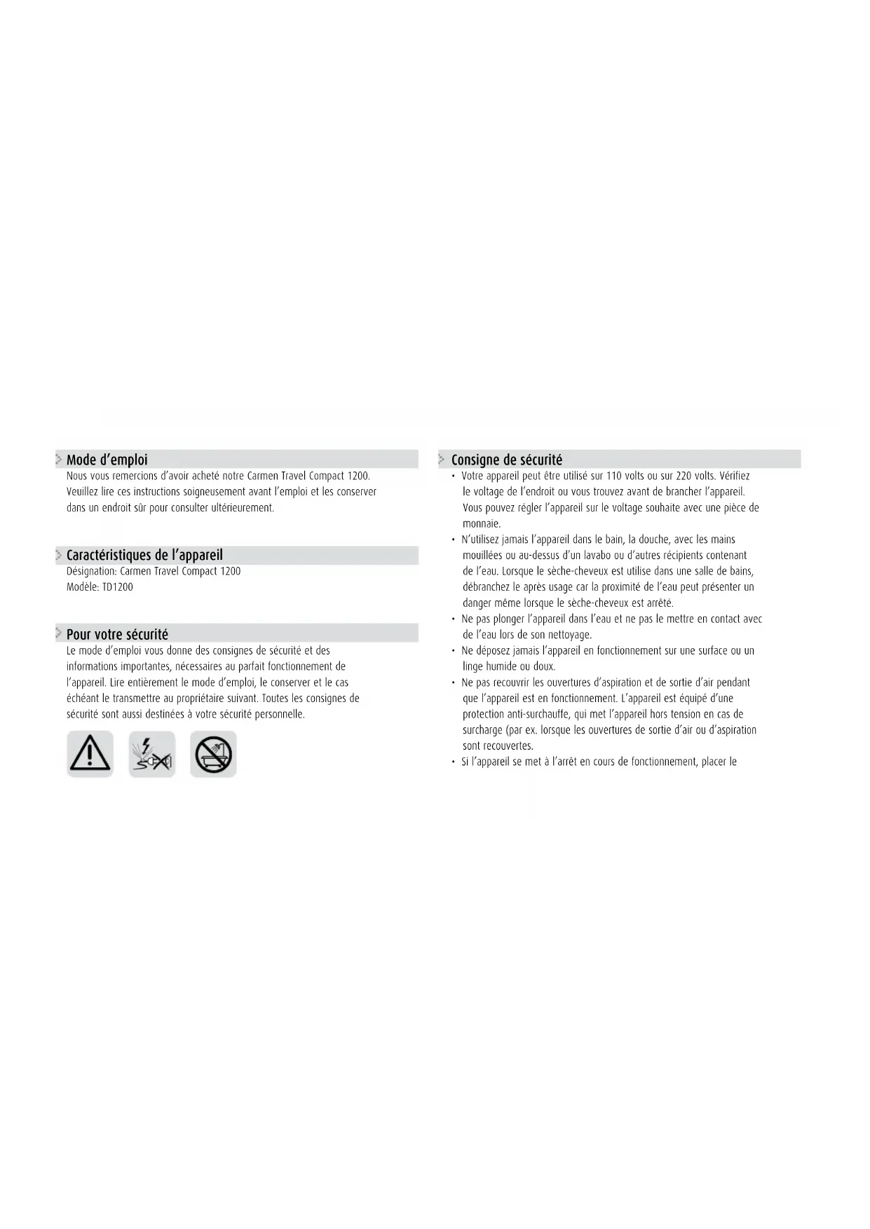TD 1200 - Sèche cheveux Carmen - Notice d'utilisation et mode d'emploi gratuit
