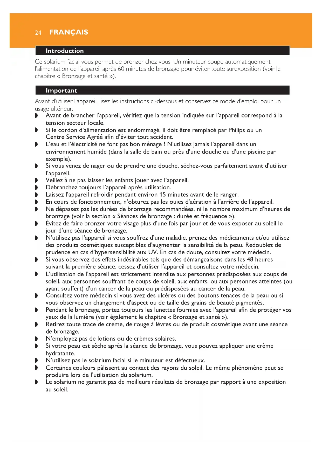 FRANÇAIS 25Remarque :Pour obtenir un bronzage uniforme, tournez votre visage légèrement vers la gauche puis vers