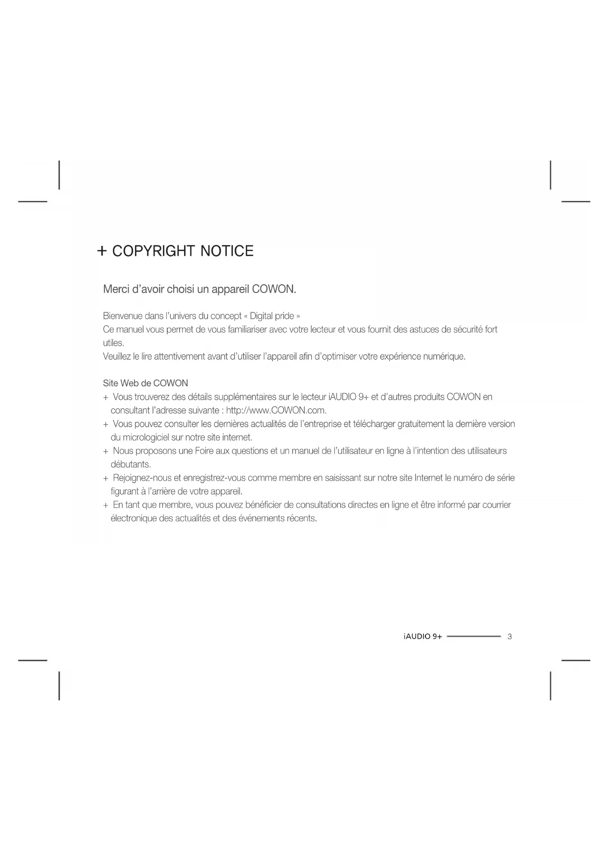+ COPYRIGHT NOTICE Merci d’avoir choisi un appareil COWON. Bienvenue dans l’univers du concept « Digital pride » Ce manuel vous permet de vous familiariser avec votre lecteur et vous fournit des astuces de sécurité fort utiles. Veuillez le lire attentivement avant d’utiliser l’appareil afin d’optimiser votre expérience numérique. Site Web de COWON + Vous trouverez des détails supplémentaires sur le lecteur iAUDIO 9+ et d’autres produits COWON en consultant l’adresse suivante : http://www.COWON.com. + Vous pouvez consulter les dernières actualités de l’entreprise et télécharger gratuitement la dernière version du micrologiciel sur notre site internet. + Nous proposons une Foire aux questions et un manuel de l’utilisateur en ligne à l’intention des utilisateurs débutants. + Rejoignez-nous et enregistrez-vous comme membre en saisissant sur notre site Internet le numéro de série figurant à l’arrière de votre appareil. + En tant que membre, vous pouvez bénéficier de consultations directes en ligne et être informé par courrier électronique des actualités et des événements récents.4 iAUDIO 9+ + COPYRIGHT NOTICE Généralités + COWON est une marque déposée de COWON SYSTEMS, Inc. + Les informations contenues dans ce manuel sont la propriété exclusive de COWON SYSTEMS, Inc. ; il est donc interdit de distribuer tout ou partie de ce manuel sans autorisation préalable. + COWON SYSTEMS, Inc. se conforme aux lois et réglementations relatives aux enregistrements, aux vidéos et aux jeux. Il incombe à l’utilisateur de respecter toutes les lois et réglementations afférentes. + Rendez-vous sur notre site http://www.COWON.com et rejoignez-nous en tant que membre. Vous pourrez alors bénéficier d’avantages réservés uniquement aux membres enregistrés. + Les illustrations, graphiques, photos et spécifications du produit contenus dans ce manuel peuvent faire l’objet de modifications ou de mises à jour sans préavis. À propos de BBE + Cet appareil est produit sous la licence de BBE Sound, Inc. (USP4638258, 5510752 et 5736897). + BBE et les symboles BBE sont des marques déposées de BBE Sound, Inc.+ Sommaire Avant de commencer ! 7 Précautions Contenu de l’emballage Noms des pièces et fonctions Touches Charge Branchement et débranchement de l’ordinateur Mise à jour du micrologiciel Utilisation de base 16 Afchage Navigateur Musique Vidéo Images (Afcheur d’images) Documents (Afcheur de texte) Radio (radio FM) Enregistreur Flash Réglages6 iAUDIO 9+ + Sommaire Informations supplémentaires 38 Spécications du produit Dépannage 40iAUDIO 9+