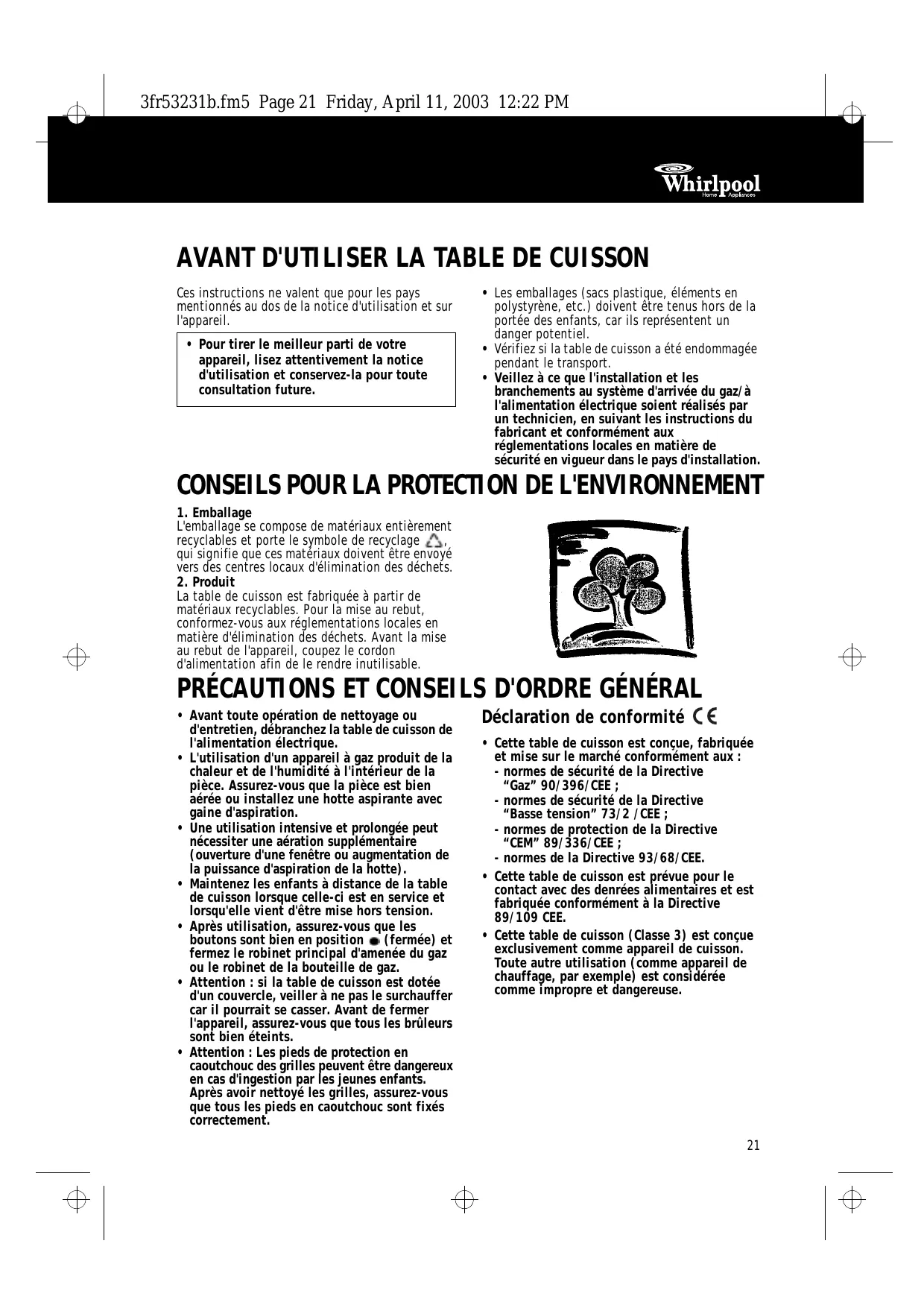 La table de cuisson est fabriquée à partir de matériaux recyclables. Pour la mise au rebut, conformez-vous aux réglementations locales en matière d'élimination des déchets. Avant la mise au rebut de l'appareil, coupez le cordon d'alimentation afin de le rendre inutilisable. PRÉCAUTIONS ET CONSEILS D'ORDRE GÉNÉRAL