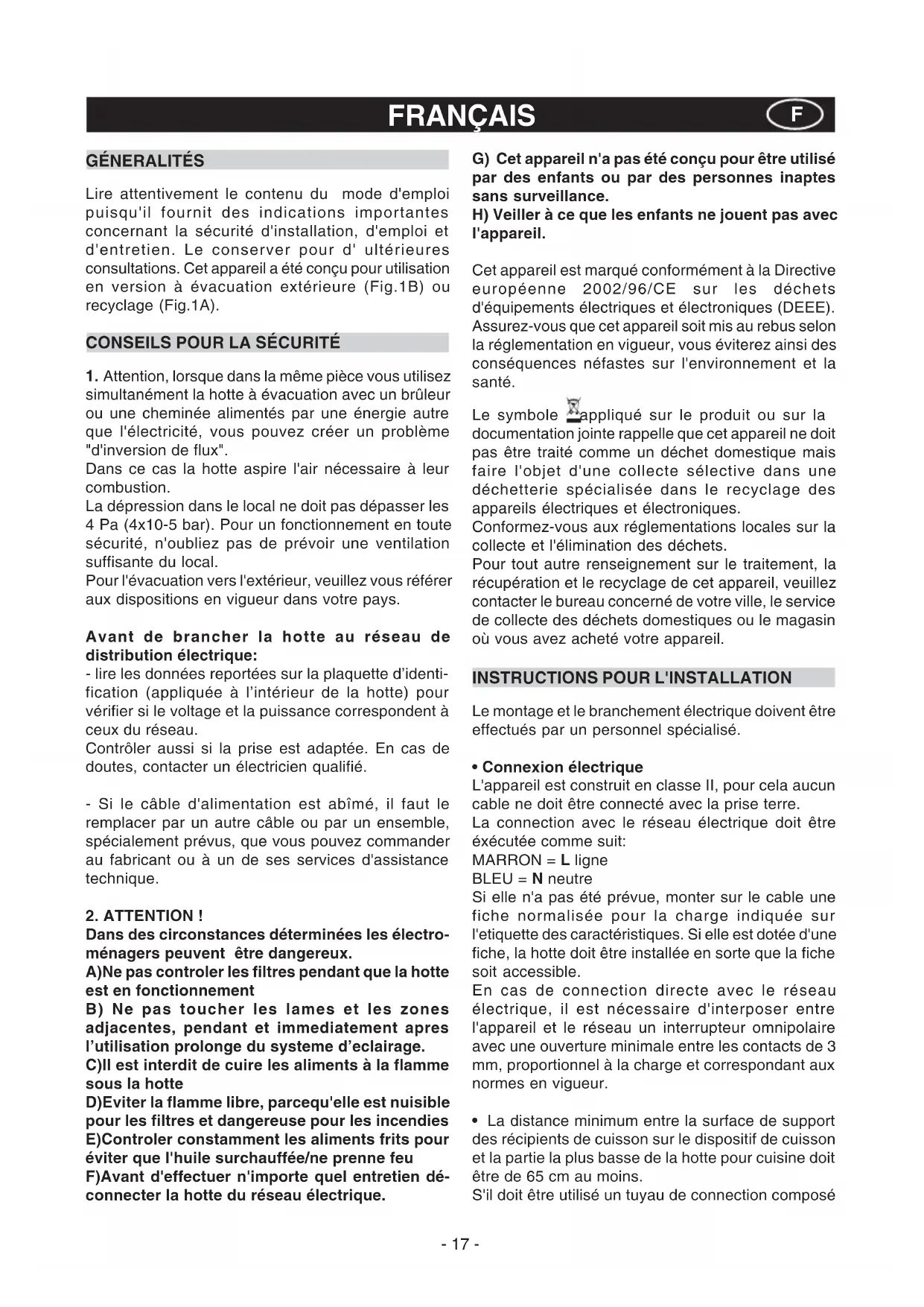 Dans des circonstances déterminées les électro- ménagers peuvent être dangereux. A)Ne pas controler les filtres pendant que la hotte est en fonctionnement B) Ne pas toucher les lames et les zones adjacentes, pendant et immediatement apres l’utilisation prolonge du systeme d’eclairage. C)Il est interdit de cuire les aliments à la flamme sous la hotte D)Eviter la flamme libre, parcequ'elle est nuisible pour les filtres et dangereuse pour les incendies E)Controler constamment les aliments frits pour éviter que l'huile surchauffée/ne prenne feu F)Avant d'effectuer n'importe quel entretien dé- connecter la hotte du réseau électrique. G) Cet appareil n'a pas été conçu pour être utilisé par des enfants ou par des personnes inaptes sans surveillance. H) Veiller à ce que les enfants ne jouent pas avec l'appareil. Cet appareil est marqué conformément à la Directive européenne 2002/96/CE sur les déchets d'équipements électriques et électroniques (DEEE). Assurez-vous que cet appareil soit mis au rebus selon la réglementation en vigueur, vous éviterez ainsi des conséquences néfastes sur l'environnement et la santé. Le symbole appliqué sur le produit ou sur la documentation jointe rappelle que cet appareil ne doit pas être traité comme un déchet domestique mais faire l'objet d'une collecte sélective dans une déchetterie spécialisée dans le recyclage des appareils électriques et électroniques. Conformez-vous aux réglementations locales sur la collecte et l'élimination des déchets. Pour tout autre renseignement sur le traitement, la récupération et le recyclage de cet appareil, veuillez contacter le bureau concerné de votre ville, le service de collecte des déchets domestiques ou le magasin où vous avez acheté votre appareil.