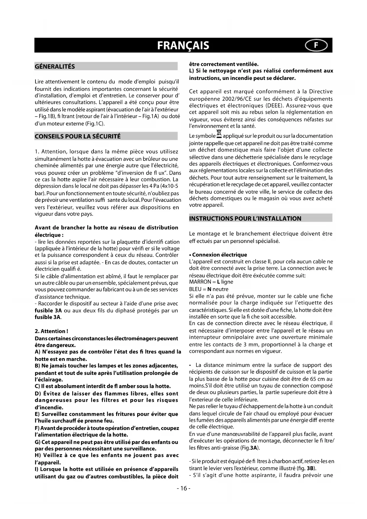 Si elle n'a pas eté prévue, monter sur le cable une fiche normalisée pour la charge indiquée sur l'etiquette des caractéristiques. Si elle est dotée d'une fiche, la hotte doit être installée en sorte que la fi che soit accessible.