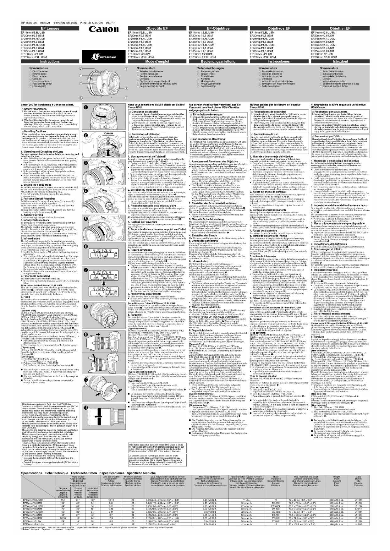 EF14mm f/2,8L USM EF20mm f/2,8 USM EF24mm f/1,4L USM EF28mm f/1,8 USM EF35mm f/1,4L USM EF50mm f/1,4 USM EF85mm f/1,8 USM EF100mm f/2 USM EF200mm f/2,8L USM Nous vous remercions d’avoir choisi cet objectif Canon USM. Consignes de sécurité 1. Ne regardez jamais le soleil ou une source de lumière vive à travers l’objectif ou l’appareil. Vous pourriez endommager votre vue. Viser directement le soleil dans l’objectif est particulièrement dangereux. 2. Que l’objectif soit monté ou non sur l’appareil, ne le laissez pas exposé au soleil sans le munir de son bouchon. C’est pour éviter l’effet de loupe qui pourrait déclencher un incendie. Précautions d’utilisationSi l’objectif est amené d’un environnement froid à un environnement chaud, de la condensation risque de se déposer sur la surface de l’objectif et sur les pièces internes.