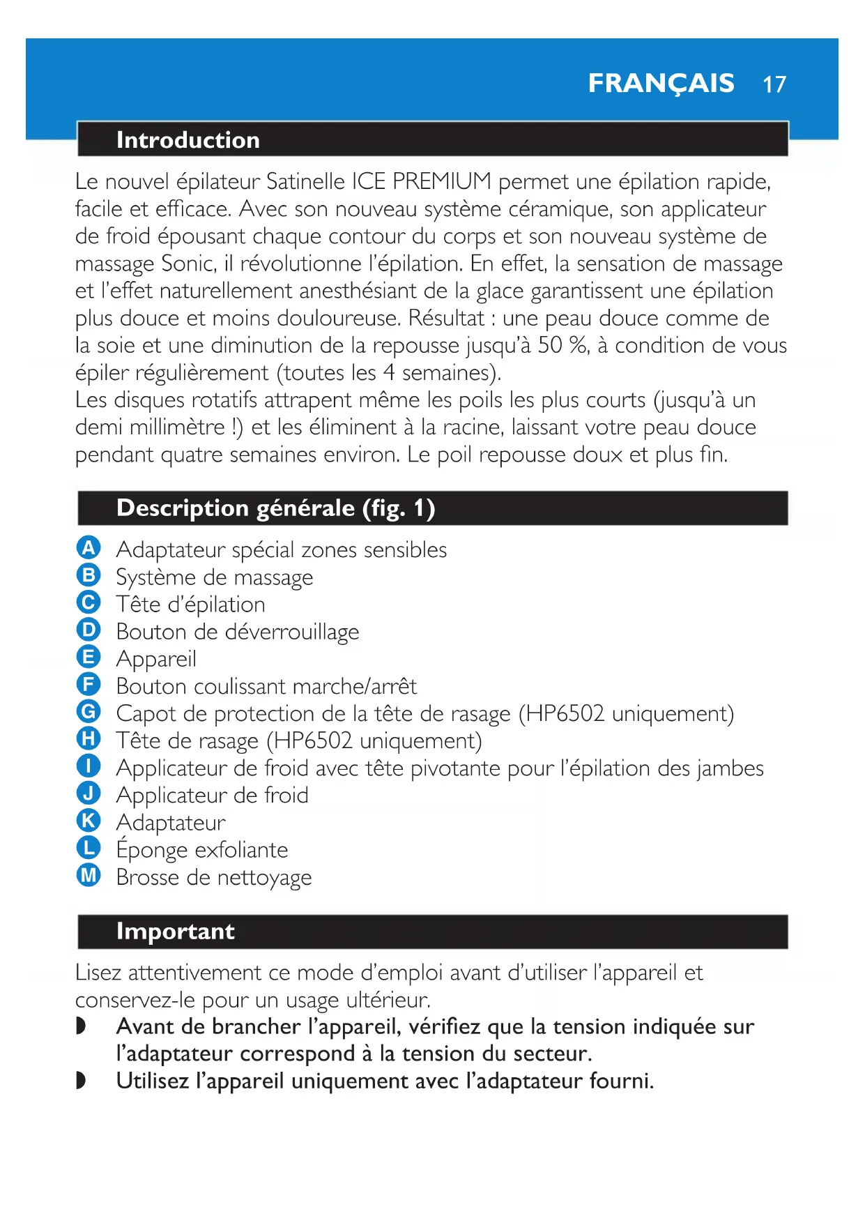 FRANÇAISN’utilisez pas l’appareil lorsque celui-ci ou l’adaptateur est endommagé. Si l’adaptateur est endommagé, remplacez-le toujours par un adaptateur de même type pour éviter tout accident. L’adaptateur contient un transformateur. N’essayez pas de remplacer la che de l’adaptateur pour éviter tout accident. Évitez de mouiller l’appareil et l’adaptateur. Tenez l’appareil hors de portée des enfants. Conservez votre appareil à une température comprise entre 5 °C et 35 °C. Pour prévenir tout dommage ou blessure, évitez de faire fonctionner l’appareil près de vos cheveux, de vos sourcils et cils, ainsi qu’à proximité de vêtements, ls, câbles, brosses, etc. N’utilisez pas la tête d’épilation sans avoir consulté votre médecin, si votre peau est irritée ou si vous souffrez de varices, rougeurs, tâches de vin (avec pilosité) ou blessures. Les mêmes recommandations s’appliquent aux personnes ayant une immunité réduite ou souffrant du diabète, de la maladie de Raynaud ou d’immunodécience. Vériez toujours la tête de rasage avant d’utiliser l’appareil. An d’éviter tout accident, n’utilisez pas la tête de rasage si la grille ou les tondeuses sont endommagées. Champs électromagnétiques Cet appareil Philips est conforme à toutes les normes relatives aux champs électromagnétiques (CEM). Il répond aux règles de sécurité établies sur la base des connaissances scientiques actuelles s’il est manipulé correctement et conformément aux instructions de ce mode d’emploi. Avant l’utilisation Congélation de l’applicateur de froid 1 Placez l’applicateur de froid SANS le manchon dans le congélateur (***), au moins 4 heures avant de commencer l’épilation. Dès que le liquide est devenu complètement bleu, l’applicateur peut être utilisé.