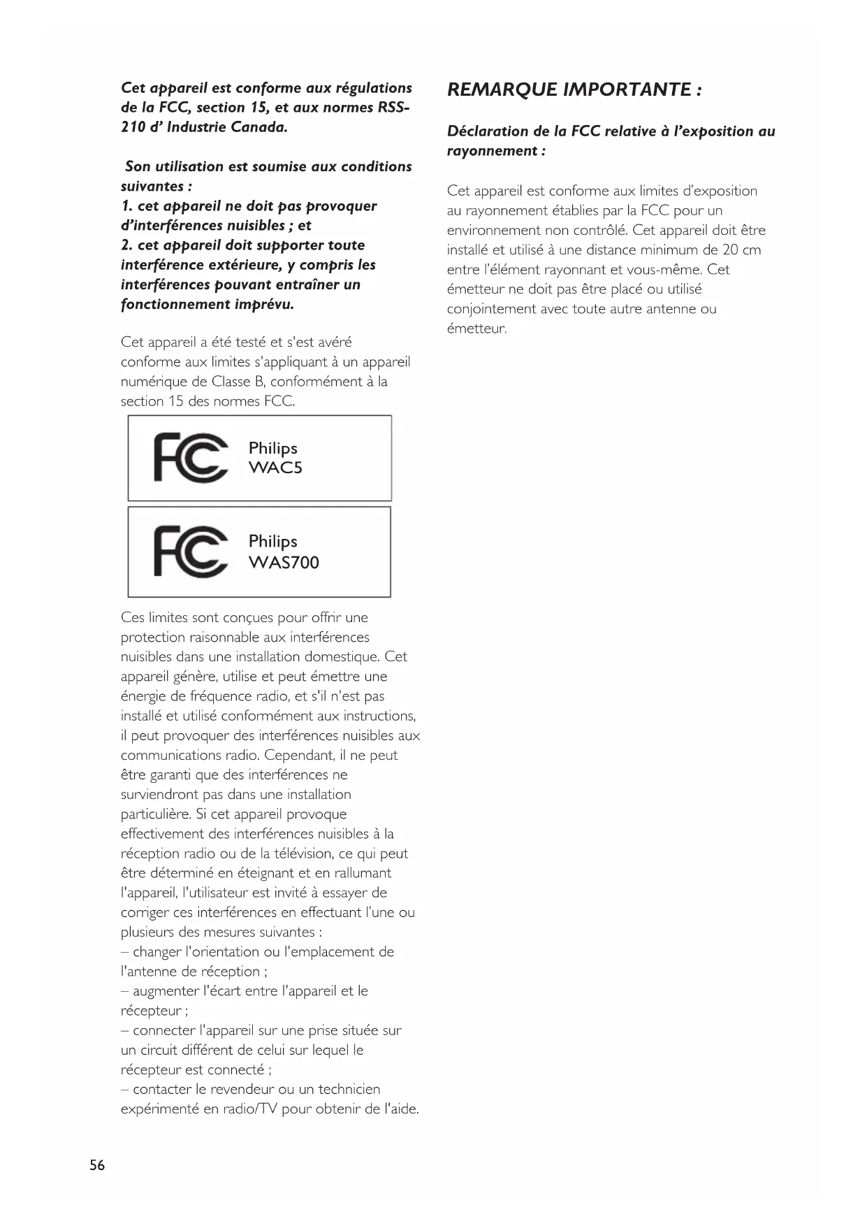 - Ces limites sont conçues pour offrir une protection raisonnable aux interférences nuisibles dans une installation domestique. Cet appareil génère, utilise et peut émettre une énergie de fréquence radio, et s'il n'est pas installé et utilisé conformément aux instructions, il peut provoquer des interférences nuisibles aux communications radio. Cependant, il ne peut être garanti que des interférences ne surviendront pas dans une installation particulière. Si cet appareil provoque effectivement des interférences nuisibles à la réception radio ou de la télévision, ce qui peut être déterminé en éteignant et en rallumant l'appareil, l'utilisateur est invité à essayer de corriger ces interférences en effectuant l’une ou plusieurs des mesures suivantes : – changer l'orientation ou l'emplacement de l'antenne de réception ; – augmenter l'écart entre l'appareil et le récepteur ; – connecter l'appareil sur une prise située sur un circuit différent de celui sur lequel le récepteur est connecté ; – contacter le revendeur ou un technicien expérimenté en radio/TV pour obtenir de l'aide. REMARQUE IMPORTANTE : Déclaration de la FCC relative à l’exposition au rayonnement : Cet appareil est conforme aux limites d’exposition au rayonnement établies par la FCC pour un environnement non contrôlé. Cet appareil doit être installé et utilisé à une distance minimum de 20 cm entre l’élément rayonnant et vous-même. Cet émetteur ne doit pas être placé ou utilisé conjointement avec toute autre antenne ou émetteur. Philips WAC5 Philips WAS700 p053-p077-WACS57_Fre-1 1/24/2006, 17:045657 Français Sommaire Information Générales A propos du WACS57 p. 59