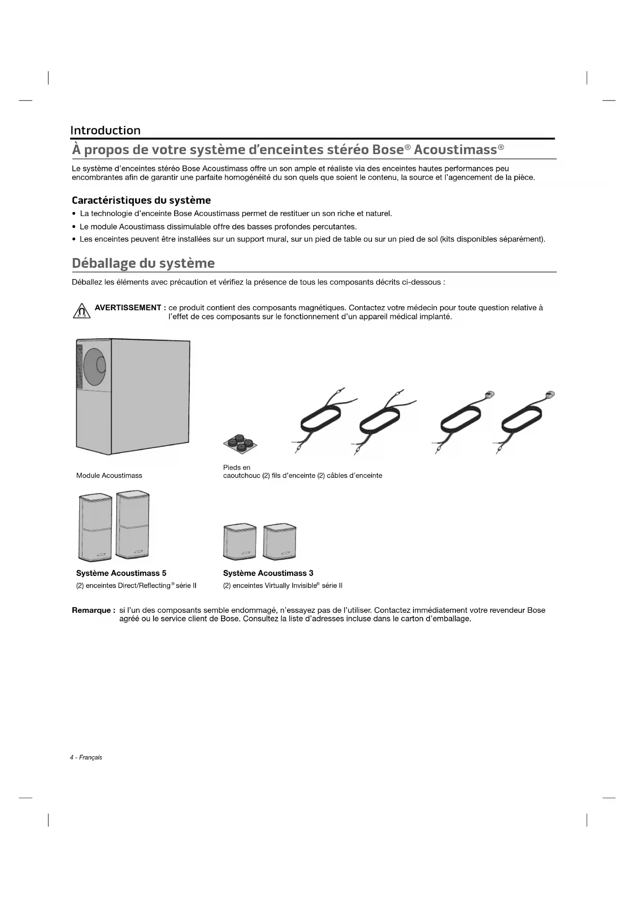l’effet de ces composants sur le fonctionnement d’un appareil médical implanté. Module AcoustimassPieds en caoutchouc (2) fils d’enceinte (2) câbles d’enceinte Système Acoustimass 5 (2) enceintes Direct/Reflecting ® série II Système Acoustimass 3 (2) enceintes Virtually Invisible ® série II Remarque : si l’un des composants semble endommagé, n’essayez pas de l’utiliser. Contactez immédiatement votre revendeur Bose