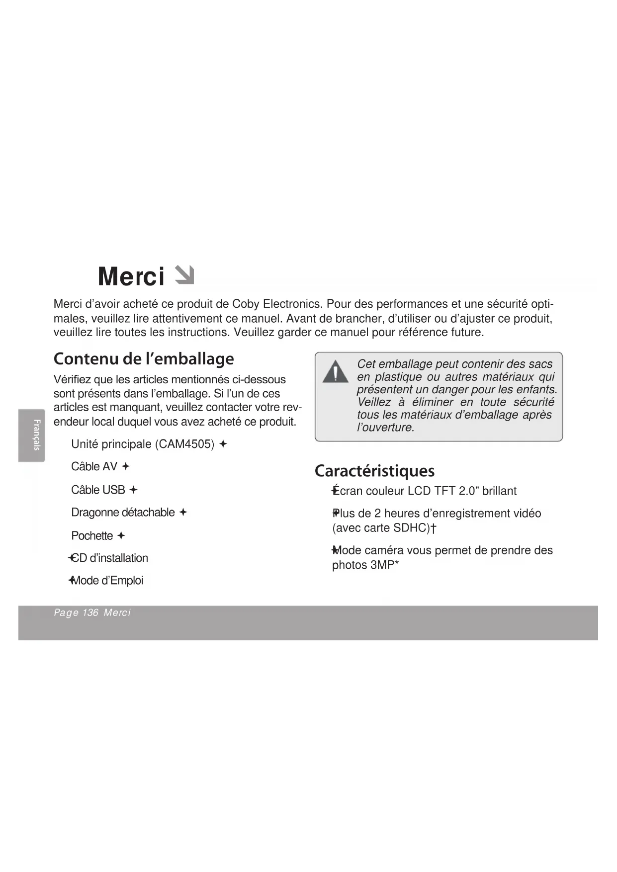 Merci d'avoir acheté ce produit de Coby Electronics. Pour des performances et une sécurité optimes, veuilles lire attentivement ce manuel. Avant de brancher, d'utiliser ou d'ajuster ce produit, veuilles lire toutes les instructions. Veuilles garder ce manuel pour reference future.