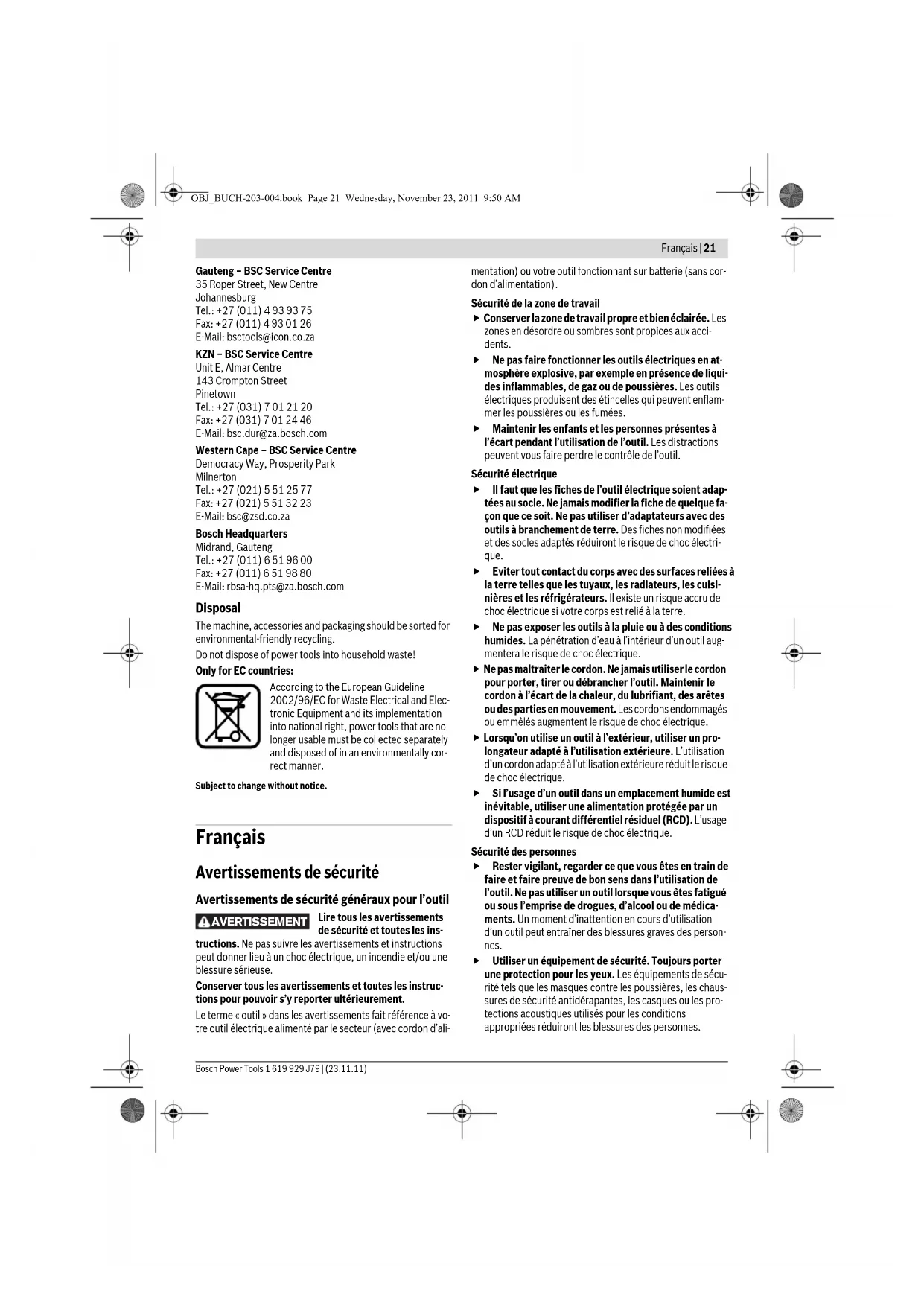 adapter 46 is freely movable. OBJ_BUCH-203-004.book Page 19 Wednesday, November 23, 2011 9:50 AM20 | English 1 619 929 J79 | (23.11.11) Bosch Power Tools Choose a suitable guide bushing, depending on the thickness of the template or the pattern. Because of the projecting height of the guide bushing, the template must have a mini- mum thickness of 8 mm. Actuate the release lever 46 and insert the guide bushing 47 from below into the guide bushing adapter 44. Ensure that the encoding keys clearly engage in the grooves of the guide bushing. f Select a router bit with a diameter smaller than the in- terior diameter of the guide bushing. To ensure that the distance from router bit centre and guide bushing edge is uniform, the guide bushing and the guide plate can be adjusted to each other, if required. – Push the release lever 22 down and guide the router to the stop in the direction of the base plate 12. Let go of the re- lease lever 22 again, in order to lock this plunging depth. – Unscrew the countersunk head screws 49. Screw the pan head screws 48 into the holes intended for this purpose in such a manner that the guide plate 9 can be moved freely. – Insert the centring pin 50 into the tool holder as shown in the figure. Hand-tighten the tightening nut so that the cen- tring pin can still be moved freely. – Align the centring pin 50 and the guide bushing 47 to each other by slightly moving the guide plate 9. – Tighten the pan head screws 48. – Remove the centring pin 50 from the tool holder. – Push the release lever 22 and guide the plunge router to the uppermost position. For routing with the guide bushing 47 proceed as follows: – Guide the switched on power tool with the guide bushing toward the template. – Push the release lever 22 down and slowly lower the plunge router until the adjusted depth-of-cut is reached. Let go of the release lever 22 again to lock this cutting depth. – Guide the switched on power tool with the protruding guide bushing alongside the template applying lateral pressure. Maintenance and Service Maintenance and Cleaning f Before any work on the machine itself, pull the mains plug. f For safe and proper working, always keep the machine and ventilation slots clean. f In extreme conditions, always use dust extraction as far as possible. Blow out ventilation slots frequently and install a residual current device (RCD). When work- ing metals, conductive dust can settle in the interior of the power tool. The total insulation of the power tool can be im- paired. If the replacement of the supply cord is necessary, this has to be done by Bosch or an authorized Bosch service agent in or- der to avoid a safety hazard. If the machine should fail despite the care taken in manufac- turing and testing procedures, repair should be carried out by an after-sales service centre for Bosch power tools. In all correspondence and spare parts order, please always in- clude the 10-digit article number given on the type plate of the machine. After-sales Service and Customer Assistance Our after-sales service responds to your questions concern- ing maintenance and repair of your product as well as spare parts. Exploded views and information on spare parts can al- so be found under: www.bosch-pt.com Our customer service representatives can answer your ques- tions concerning possible applications and adjustment of products and accessories. Great Britain Robert Bosch Ltd. (B.S.C.) P.O. Box 98 Broadwater Park North Orbital Road Denham Uxbridge UB 9 5HJ Tel. Service: +44 (0844) 736 0109 Fax: +44 (0844) 736 0146 E-Mail: boschservicecentre@bosch.com Ireland Origo Ltd. Unit 23 Magna Drive Magna Business Park City West Dublin 24 Tel. Service: +353 (01) 4 66 67 00 Fax: +353 (01) 4 66 68 88 Australia, New Zealand and Pacific Islands Robert Bosch Australia Pty. Ltd. Power Tools Locked Bag 66 Clayton South VIC 3169 Customer Contact Center Inside Australia: Phone: +61 (01300) 307 044 Fax: +61 (01300) 307 045 Inside New Zealand: Phone: +64 (0800) 543 353 Fax: +64 (0800) 428 570 Outside AU and NZ: Phone: +61 (03) 9541 5555 www.bosch.com.au Republic of South Africa Customer service Hotline: +27 (011) 6 51 96 00 OBJ_BUCH-203-004.book Page 20 Wednesday, November 23, 2011 9:50 AMFrançais | 21 Bosch Power Tools 1 619 929 J79 | (23.11.11) Gauteng – BSC Service Centre 35 Roper Street, New Centre Johannesburg Tel.: +27 (011) 4 93 93 75 Fax: +27 (011) 4 93 01 26 E-Mail: bsctools@icon.co.za KZN – BSC Service Centre Unit E, Almar Centre 143 Crompton Street Pinetown Tel.: +27 (031) 7 01 21 20 Fax: +27 (031) 7 01 24 46 E-Mail: bsc.dur@za.bosch.com Western Cape – BSC Service Centre Democracy Way, Prosperity Park Milnerton Tel.: +27 (021) 5 51 25 77 Fax: +27 (021) 5 51 32 23 E-Mail: bsc@zsd.co.za Bosch Headquarters Midrand, Gauteng Tel.: +27 (011) 6 51 96 00 Fax: +27 (011) 6 51 98 80 E-Mail: rbsa-hq.pts@za.bosch.com Disposal The machine, accessories and packaging should be sorted for environmental-friendly recycling. Do not dispose of power tools into household waste! Only for EC countries: According to the European Guideline 2002/96/EC for Waste Electrical and Elec- tronic Equipment and its implementation into national right, power tools that are no longer usable must be collected separately and disposed of in an environmentally cor- rect manner. Subject to change without notice. Français Avertissements de sécurité Avertissements de sécurité généraux pour l’outil Lire tous les avertissements de sécurité et toutes les ins- tructions. Ne pas suivre les avertissements et instructions peut donner lieu à un choc électrique, un incendie et/ou une blessure sérieuse. Conserver tous les avertissements et toutes les instruc- tions pour pouvoir s’y reporter ultérieurement. Le terme « outil » dans les avertissements fait référence à vo- tre outil électrique alimenté par le secteur (avec cordon d’ali- mentation) ou votre outil fonctionnant sur batterie (sans cor- don d’alimentat