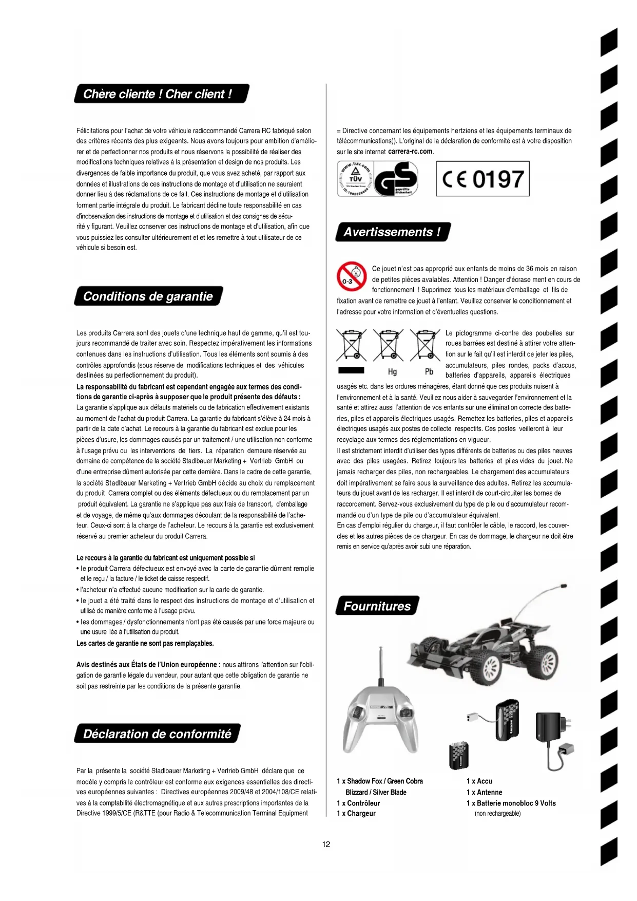 Clean the Carrera RC car after use. Now it’s time to practise! Set up a Car- rera RC vehicle racing track in a large empty area, using cornerposts, empty cans, or similar objects. The basic tech- nique to adopt when operating a Car- rera RC is to drive fast on the straight sections and to slow down in the curves. Controller functions High Speed Turbo Button Full Function You can steer the car in any direction using the joysticks: Joystick on left: forwards/backwards Joystick on right: left/right Press the button on the right-hand side of the controller to actuate the High Speed Turbo function. Errors and changes excepted Colours / nal design – changes excepted Technical changes and design-related changes excepted Pictograms = symbolic photos Should you need spare parts, you will nd a complete list of the available parts under carrerarc.com in the service area. Problem Cause Solution Car does not move Either the switch on the controller or the car is set to OFF. Switch on. There is no rechargeable battery in the car or the battery is too weak. Insert charged battery. The car has come to a stop at an obstacle. The voltage surge protector has switched the car o. Turn the ON/OFF switch on the car to OFF, then back to ON, and place the car on a clear surface. The battery or rechargeable battery in the transmitter or model is too weak. Insert new battery or recharged battery. Dierent channel set up for car and controls. Switch to same channel. The transmitter has switched itself o after 30 minutes. To restart, switch the ON/OFF switch on both controller & vehicle to OFF and then back to ON.. The vehicle is very warm. Switch both car and controller o and allow the car to cool down for about 30 minutes. Car cannot be controlled Vehicle starts moving unintentionally. First turn on the transmitter, only then the vehicle. Transmitter antenna is defective. Extend the antenna fully. Another RC model is using the same frequency. Change the frequency. Troubleshooting12 Chère cliente ! Cher client ! Félicitations pour l’achat de votre véhicule radiocommandé Carrera RC fabriqué selon des critères récents des plus exigeants. Nous avons toujours pour ambition d’amélio- rer et de perfectionner nos produits et nous réservons la possibilité de réaliser des modications techniques relatives à la présentation et design de nos produits. Les divergences de faible importance du produit, que vous avez acheté, par rapport aux données et illustrations de ces instructions de montage et d’utilisation ne sauraient donner lieu à des réclamations de ce fait. Ces instructions de montage et d’utilisation forment partie intégrale du produit. Le fabricant décline toute responsabilité en cas d’inobservation des instructions de montage et d’utilisation et des consignes de sécu- rité y gurant. Veuillez conserver ces instructions de montage et d’utilisation, an que vous puissiez les consulter ultérieurement et et les remettre à tout utilisateur de ce véhicule si besoin est. Conditions de garantie Les produits Carrera sont des jouets d’une technique haut de gamme, qu’il est tou- jours recommandé de traiter avec soin. Respectez impérativement les informations contenues dans les instructions d’utilisation. Tous les éléments sont soumis à des contrôles approfondis (sous réserve de modications techniques et des véhicules destinées au perfectionnement du produit). La responsabilité du fabricant est cependant engagée aux termes des condi tions de garantie ciaprès à supposer que le produit présente des défauts : La garantie s’applique aux défauts matériels ou de fabrication eectivement existants au moment de l’achat du produit Carrera. La garantie du fabricant s’élève à 24 mois à partir de la date d’achat. Le recours à la garantie du fabricant est exclue pour les pièces d’usure, les dommages causés par un traitement / une utilisation non conforme à l’usage prévu ou les interventions de tiers. La réparation demeure réservée au domaine de compétence de la société Stadlbauer Marketing + Vertrieb GmbH ou d’une entreprise dûment autorisée par cette dernière. Dans le cadre de cette garantie, la société Stadlbauer Marketing + Vertrieb GmbH décide au choix du remplacement du produit Carrera complet ou des éléments défectueux ou du remplacement par un produit équivalent. La garantie ne s’applique pas aux frais de transport, d’emballage et de voyage, de même qu’aux dommages découlant de la responsabilité de l’ache- teur. Ceux-ci sont à la charge de l’acheteur. Le recours à la garantie est exclusivement réservé au premier acheteur du produit Carrera. Le recours à la garantie du fabricant est uniquement possible si