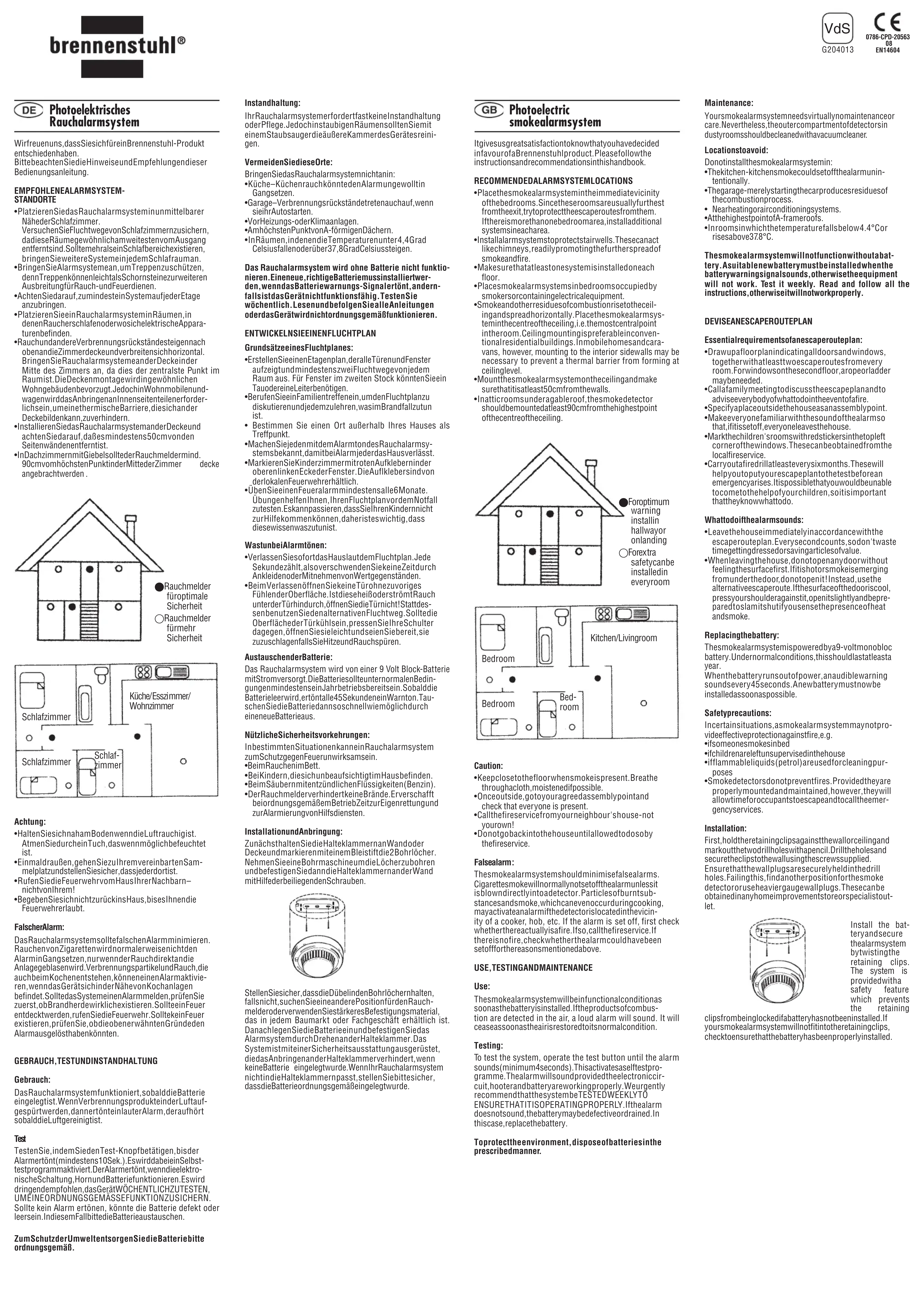 - Le détecteur de fumée n’empêche pas l’incendie. Lorsqu’il fonctionne, il vous permet d’avoir l e temps de vous sau- ver et d’alerter les services d’aide. Installation et pose: Tout d’abord, maintenez l e crochet sur le mur ou le pl afond et marquez avec un crayon à papier les deux trous à percer. Prenez une perceuse pour percer les trous e t fixez ensuite les crochets au mur à l’aide des vis fournies. Assurez-vous que les chevilles tiennent dans les trous, si ce n’est pas le cas, trou- vez une autre position pour le détecteur de fumées ou utili- sez un mat éri au de fixation plus gros, disponibles dans tous les magasins spécialisés. Ensuite, mettez la pile et fixez le système d’alarme en le fai- sant tourner sur le crochet. Le système est muni d’un équi- pement de sécurité qui empêche de le fixer sur le crochet s’il n’y a pas de pile. Si votre système de dét ection de fumées ne se fixe pas sur le crochet, veuillez vous assurer que la pile est correctement placée. Foto-elektrisch rookalarmsysteem Wij zijn verheugd dat u voor een product van Brennenstuhl hebt gekozen. Gelieve de aanwijzingen en aanbevelingen van deze handlei- ding te volgen.