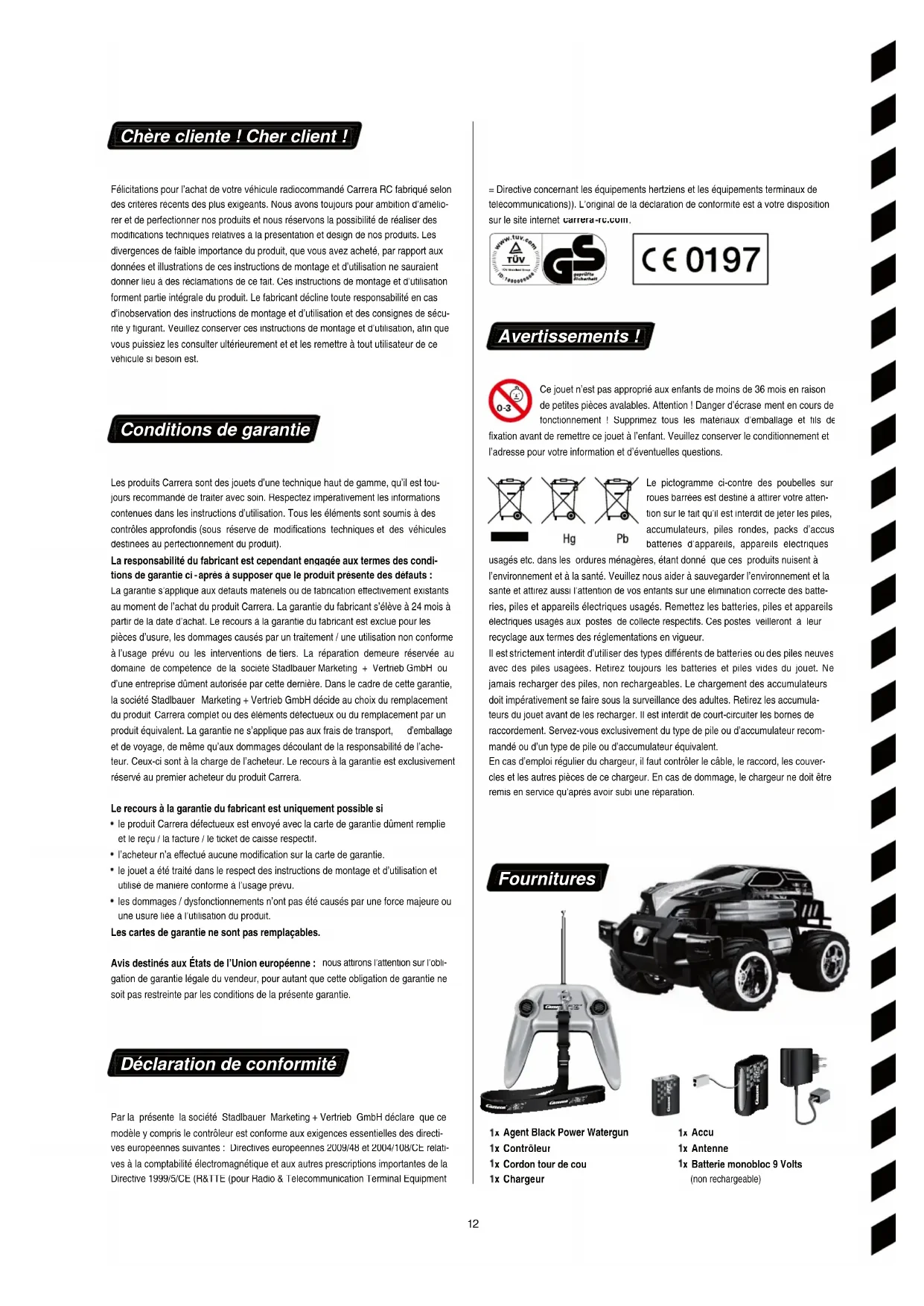 dans toutes les directions à l’aide des Joysticks. Joystick gauche : avant, arrière Joystick droite : gauche, droite Vous activez la fonction turbo grande vitesse en appuyant sur le bouton du haut sur le côté gauche du contrôleur. Pour remplir le réservoir d’eau de l’Agent Black, enfoncer le bouton sur le toit du véhicule. Ensuite le comparti- ment avec la tubulure de remplissage s’ouvre. Les joysticks de la télécommande sont amovibles. Les commandes sont alors identiques à une télécommandes tradi- tionelles. Remplir avec précaution le véhicule d’eau à l’aide d’une bouteille. Attention : ne pas utiliser d’autres liquides ! Vous pouvez ranger les joysticks dans le compartiment prévu à cet eet dans le dos des poignées de la télécom- mande. Activer le Watergun en appuyant sur le bouton, du côté droit du contrôleur. Fixer le mousqueton du cordon à l’anneau de la télécommande et suspendez le autour du cou. Solutions aux problèmes Fonctions de la télécommande Si vous avez besoin de pièces de rechange, vous trouverez une vue d‘ensemble complète des pièces disponibles sur carrerarc.com dans la zone de Service. Sous réserve d´erreurs et de modications Couleurs / design nal – sous réserve de modications Sous réserve de modications techniques et relatives au design Pictogrammes = photos symboliques Problème Cause Remède Le véhicule ne roule pas L’interrupteur de la télécommande ou du véhicule sont en position « OFF » Mettre en position « ON » Batterie faible ou absence de batterie dans le véhicule Insérer une batterie chargée La voiture s’est immobilisée devant un obstacle. Le coupe-circuit de surtension a débranché la voiture. Commuter le commutateur ON/OFF sur le véhicule une fois sur OFF, puis à nouveau sur ON et le placer sur une surface libre. Batterie ou pile trop faible dans le véhicule ou la télécommande Insérez une batterie ou une pile neuve Véhicule et contrôleur réglés sur des canaux diérents Régler sur le même canal L’émetteur s’est débranché de soi-même après 30 minutes. Pour l’utiliser à nouveau, brancher le commutateur ON/OFF sur le contrôleur et le véhicule une fois sur OFF et ensuite à nouveau sur ON. Le véhicule est très chaud. Débrancher le véhicule et le contrôleur et laisser refroidir le véhicule durant 30 minutes env. Contrôle du véhicule Le véhicule démarre intempestivement. Enclencher tout d‘abord l‘émetteur puis le véhicule. L’antennes de la télécommande est défectueuse Sortez l’antenne complétement Un autre véhicule Carrera RC utilise la même fréquence Changez la fréquence choisie Mise en service du Watergun16 Estimado cliente Le felicitamos por la compra de su modelo de vehículo Carrera RC que ha sido fabri- cado conforme a la tecnología más avanzada. Constantemente nos esforzamos por perfeccionar y mejorar nuestros productos, por lo que nos reservamos el derecho de realizar modicaciones en el aspecto técnico y en relación al equipamiento, material y diseño en cualquier momento y sin previo aviso. Por ello, no podrá derivarse ningún derecho por pequeñas diferencias entre este producto y los datos y las guras de estas instrucciones. Estas instrucciones de uso y de montaje son parte integrante del producto. En caso de que no se cumplan las instrucciones de uso y las indicaciones de seguridad contenidas en ellas, se extinguirá el derecho de garantía. Guarde bien estas instrucciones para poder consultarlas más tarde, y entréguelas a terceros cuando les traspase el modelo. Condiciones de garantía Los productos Carrera son juguetes de alto valor técnico, que deben ser tratados con cuidado. Es necesario que observe las indicaciones de estas instrucciones de uso. Todas las piezas han sido sometidas a un control riguroso (queda reservado el dere- cho a realizar modicaciones técnicas y cambios en el modelo, destinados a mejorar el producto). Si, a pesar de ello, se presentaran defectos, se aplicará una garantía en el marco de las siguientes condiciones: La garantía comprenderá los fallos demostrables de material y de fabricación existen- tes en el momento de la compra del producto Carrera. Esta garantía es válida durante 24 meses a partir de la fecha de compra. Quedan excluidas del derecho de garantía las piezas de desgaste y los daños debidos al tratamiento o uso incorrecto y a inter- venciones ajenas. Las reparaciones sólo las debe realizar la empresa Stadlbauer Marketing + Vertrieb GmbH o una empresa autorizada por ella. En el marco de esta garantía, la empresa Stadlbauer Marketing + Vertrieb GmbH decidirá si se cambia el producto Carrera en su totalidad o solamente las piezas defectuosas, o si se sustituye por otro producto equivalente. Quedan excluidos de la garantía los gastos de trans- porte, embalaje y ete, así como los daños imputables al comprador. Estos corren por cuenta del comprador. Solamente el primer comprador del producto Carrera podrá ejercer el derecho de garantía. El derecho a la aplicación de la garantía solamente existirá si: