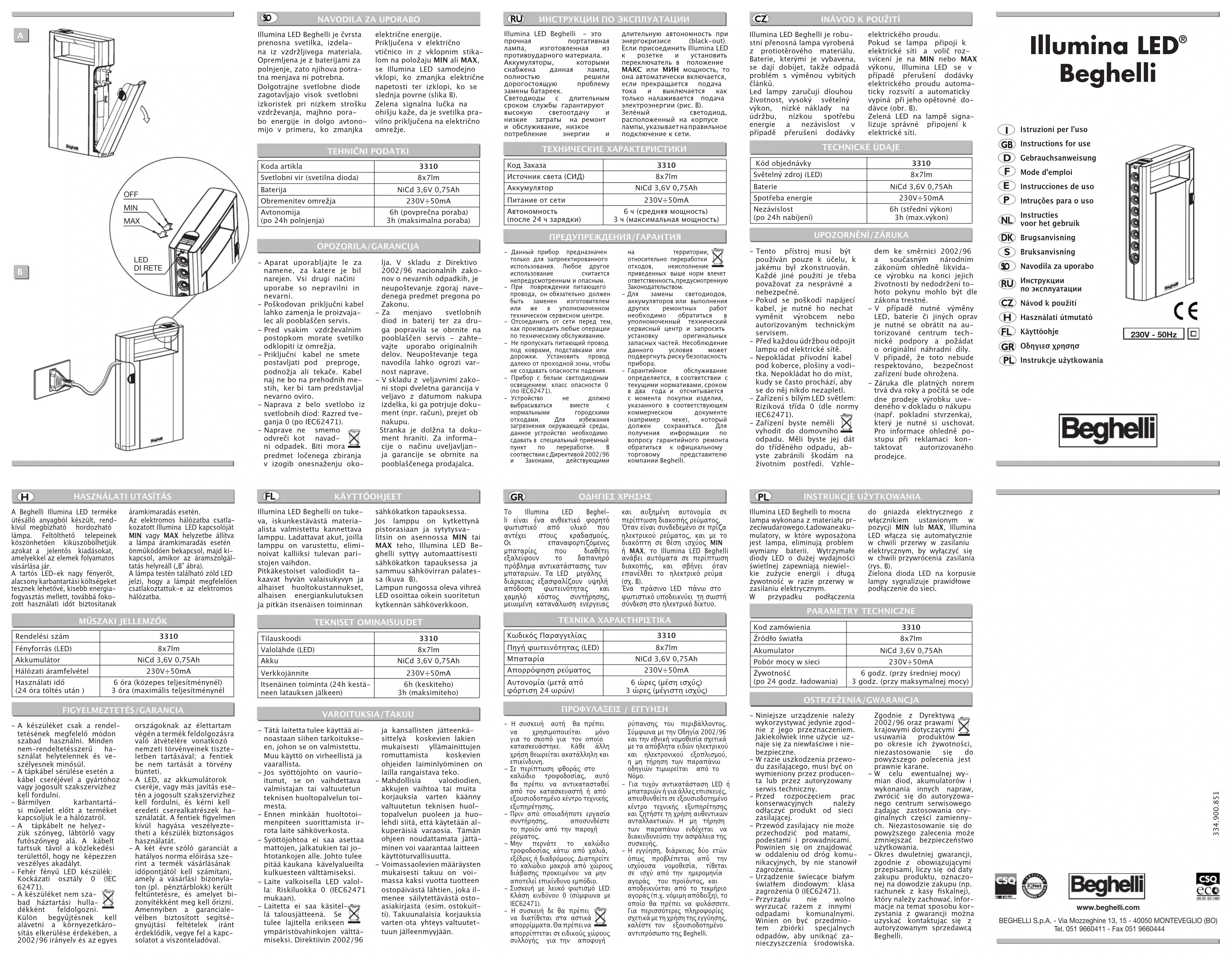 - Les meilleures perfor- mances des batteries, neuves ou inutilisées pen- dant de longues périodes, sont obtenues au bout de 3 ou 4 cycles de charge et de décharge. - Retirer les batteries des appareils quand ces der- niers sont inutilisés pen- dant de longues périodes de temps. - L’appareil doit être utili- sé exclusivement pour la fonction pour laquelle il a été conçu. Toute autre utilisation doit être con- sidérée comme impropre et dangereuse. - Ne pas modier la che de l’appareil. - Pour l’éventuel change- ment de DIODES ou bat- teries et pour toute autre réparation, s’adresser à un centre d’assistance tech- nique et exiger l’utilisa- tion de pièces détachées d’origine. Le non-respect de cette recommandation peut compromettre la sé- curité de l’appareil. - Pour tout renseignement sur les modalités d’inter- vention sous garantie, ap- peler le numéro vert 800 626626 ou contacter le revendeur agréé Beghelli. RECOMMANDATIONS/GARANTIE IlluminaLED Ricarica Be- ghelli est à la fois une lampe torche rechargea- ble contre les coupures de courant et un chargeur de batteries. Les 8 DIODES grande puissance d’IlluminaLED Ricarica assurent un ren- dement lumineux excep- tionnel, une très grande autonomie, de faibles coûts d’entretien et une consommation d’énergie réduite. Ses batteries rechargea- bles longue durée élimi- nent le problème de leur coûteux remplacement . Branchée à une prise de courant avec le sélecteur d’allumage placé sur la position puissance MIN ou MAX, IlluminaLED Ricarica s’allume automatiquement en cas de coupure de cou- rant et s’éteint dès que le courant est rétabli (g. B). Le chargeur de batteries, situé dans le logement pour câble, permet de re- charger simultanément 4 batteries rechargeables de type Ni-MH AA o AAA d’ampérages diérents. En plus de leur utilisation