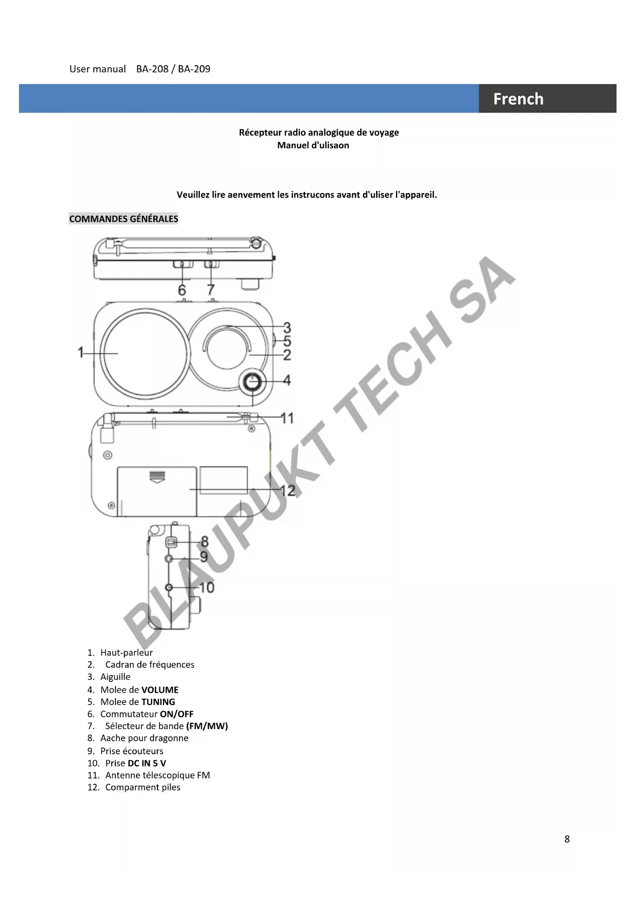 - Aucune source de flamme nue, telle que des bougies allumées, ne doit être placée sur l'appareil. BLAUPUKT TECH SAUser manual BA-208 / BA-209