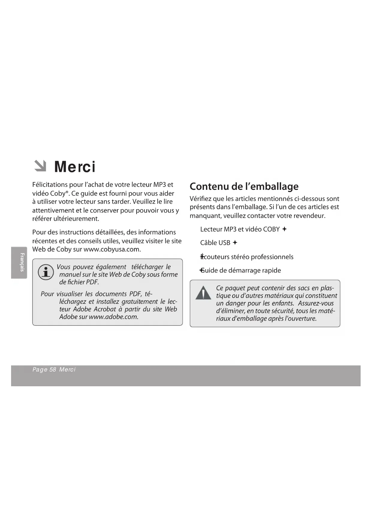 - Disponible uniquement sur MP768.Français Page 65 Connecter Et Charger La Batterie Connecter et charger la batterie  Lors de la première utilisation, le lecteur doit être complètement chargé pour assurer une performance optimale et préserver la longévité de la batterie. Si le lecteur n’a pas été utilisé pendant une longue période de temps, il faudra peut-être recharger la batterie. Avec le câble USB fourni : Connectez la petite extrémité du câble au port 1. USB du lecteur. Connectez la grande extrémité du câble à un 2. port USB 2.0 grande vitesse sur votre ordinateur. Lorsque le lecteur est connecté et en train de charger, l’avis “USB connecté” s’achera à l’écran. Conseil Vous pouvez appuyer sur <M> après que le lecteur soit connecté pour annuler la connexion de données et passer au mode d’alimentation USB. Cela vous per- mettra d’utiliser le lecteur normalement tout en ayant l’alimentation de l’ordinateur. L’ordinateur doit être allumé et non en mode veille an de recharger la batterie. Le lecteur ne chargera pas s’il est connecté à un port USB de faible puissance. Si le lecteur est connecté à l’ordinateur via un hub USB, ce dernier doit être auto- alimenté pour charger la batterie. La batterie utilisée dans cet appareil peut présenter un danger d’incendie ou de brûlure chimique si elle est malmenée. Ne démon- tez pas, ne brûlez pas et ne chauez pas la batterie. Ne laissez pas la batterie dans une voiture aux fenêtres fermées ou tout endroit exposé à la lumière directe du soleil. Ne bran- chez pas le lecteur à une source de courant autre que celle indiquée sur l’étiquette car cela pourrait entraîner un incendie ou une électrocution.Français Page 66 Installer “coby Media Manager” (gestionnaire De Médias Coby) Installer “Coby Media Manager”  (Gestionnaire de Médias Coby) Veuillez installer et utiliser le logiciel “Coby Media Manager” (CMM) (Gestionnaire de médias Coby) fourni sur le lecteur. Le fait d’utiliser le logiciel CMM est la façon la plus rapide de : Transférer (synchroniser) les chiers médias au lecteur Convertir des chiers vidéo et audio en un format compatible avec votre lecteur Garder le logiciel de votre lecteur à jour Naviguer et lire votre bibliothèque de médias sur votre ordinateur Coby Media Manager (Gestionnaire de Médias Coby) nécessite un ordinateur avec Micro- soft Windows 7/Vista/XP ou Macintosh OS X, 100 Mo d’espace disque disponible et un port USB 1.1 (USB 2.0 recommandé pour les transferts à grande vitesse).Français Page 67 Installer “coby Media Manager” (gestionnaire De Médias Coby) Microsoft Windows Branchez le lecteur sur 1. votre ordinateur au moyen du câble USB fourni. L’écran “Autoplay” s’achera. Cliquez sur “Ouvrir le dispositif pour visualiser les chiers à l’aide de Windows Ex- plorer”.Français Page 68 Installer “coby Media Manager” (gestionnaire De Médias Coby) Double-cliquez sur l’icône 2. du lecteur pour visualiser les chiers stockés sur le lecteur.Français Page 69 Installer “coby Media Manager” (gestionnaire De Médias Coby) Trouvez et double-cliquez 3. sur le chier “Coby- cometlite”, puis attendez que le système extraie les chiers de l’application principale. L’assistant d’installation 4. sera lancé automatique- ment une fois que les chiers auront été extraits. Suivez les instructions de l’écran pour terminer l’installation.Français Page 70 Installer “coby Media Manager” (gestionnaire De Médias Coby) Macintosh OS X Branchez le lecteur sur 1. votre ordinateur au moyen du câble USB fourni. Ouvrez une fenêtre de 2. recherche. Cliquez sur l'icône "Disque amovible" située sur le côté gauche de la fenêtre de recherche pour visualiser les chiers stockés sur le lecteur. Double-cliquez sur le 3. dossier “MAC OS X Coby Media Manager” pour acher son contenu. Trouvez et double-cliquez sur le chier “coby-media- manager.dmg”.Français Page 71 Installer “coby Media Manager” (gestionnaire De Médias Coby) L’assistant d’installation 4. sera lancé. Suivez les in- structions de l’écran pour terminer l’installation.Français Page 72 Transférer Des Fichiers Médias Sur Le Lecteur Transférer des chiers médias sur  le lecteur Utilisez le logiciel CMM pour transférer des chiers média d’un ordinateur au lecteur. Vous trouverez le manuel d’utilisation du logiciel CMM sur votre lecteur. Vous devrez peut-être té- lécharger et installer le lecteur Acrobat PDF gratuit d’Abobe sur www.adobe.com/go/getreader/ pour visualiser le manuel d’utilisation. Branchez le lecteur sur 1. votre ordinateur au moyen du câble USB fourni. Démarrez le programme 2. CMM.Français Page 73 Transférer Des Fichiers Médias Sur Le Lecteur Pour trouver de la mu-3. sique, des lms et des photos sur l’ordinateur, cliquez sur les onglets musique, lms ou photos situés dans le panneau de gauche.Français Page 74 Transférer Des Fichiers Médias Sur Le Lecteur Cliquez pour sélection-4. ner les chiers que vous souhaitez synchroniser, puis cliquez sur le bouton “Synchroniser la sélection” situé en haut de l’écran. Conseil Dans Windows, maintenez enfoncé “Shift” ou “Ctrl” sur le clavier tout en cliquant avec la souris pour sélectionner plu- sieurs chiers. Dans Mac OS X, maintenez en- foncé “Command” ou “Shift” en cliquant avec la souris pour sélectionner plusieurs chiers.Français Page 75 Spécications Spécications  S’il vous plaît visitez www.cobyusa.com pour les dernières informations produit. Conception, spécica- tions, et le manuel sont sujets à modications sans préavis. Série MP757 Mémoire Mémoire ash interne Achage Écran LCD TFT 2,4 po (320 x 240) Format de Fichier Pris en Charge Musique: MP3, WMA, APE, OGG, WAV Vidéo: AVI (MPEG-4/XviD), WMV9, 3GP
