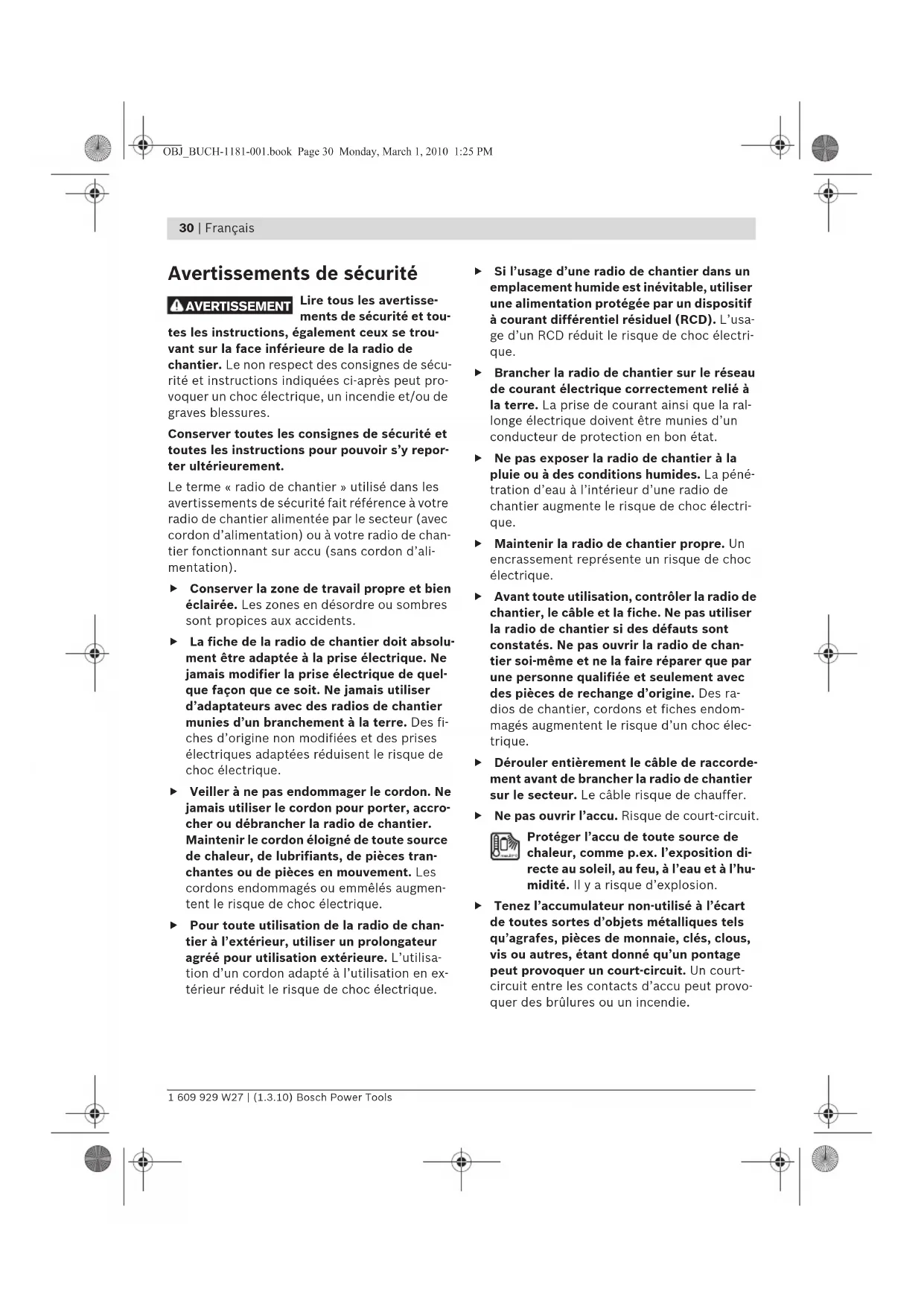 Avertissements de sécurité Lire tous les avertisse- ments de sécurité et tou- tes les instructions, également ceux se trou- vant sur la face inférieure de la radio de chantier. Le non respect des consignes de sécu- rité et instructions indiquées ci-après peut pro- voquer un choc électrique, un incendie et/ou de graves blessures. Conserver toutes les consignes de sécurité et toutes les instructions pour pouvoir s’y repor- ter ultérieurement. Le terme « radio de chantier » utilisé dans les avertissements de sécurité fait référence à votre radio de chantier alimentée par le secteur (avec cordon d’alimentation) ou à votre radio de chan- tier fonctionnant sur accu (sans cordon d’ali- mentation). f Conserver la zone de travail propre et bien éclairée. Les zones en désordre ou sombres sont propices aux accidents. f La fiche de la radio de chantier doit absolu- ment être adaptée à la prise électrique. Ne jamais modifier la prise électrique de quel- que façon que ce soit. Ne jamais utiliser d’adaptateurs avec des radios de chantier munies d’un branchement à la terre. Des fi- ches d’origine non modifiées et des prises électriques adaptées réduisent le risque de choc électrique. f Veiller à ne pas endommager le cordon. Ne jamais utiliser le cordon pour porter, accro- cher ou débrancher la radio de chantier. Maintenir le cordon éloigné de toute source de chaleur, de lubrifiants, de pièces tran- chantes ou de pièces en mouvement. Les cordons endommagés ou emmêlés augmen- tent le risque de choc électrique. f Pour toute utilisation de la radio de chan- tier à l’extérieur, utiliser un prolongateur agréé pour utilisation extérieure. L’utilisa- tion d’un cordon adapté à l’utilisation en ex- térieur réduit le risque de choc électrique. f Si l’usage d’une radio de chantier dans un emplacement humide est inévitable, utiliser une alimentation protégée par un dispositif à courant différentiel résiduel (RCD). L’usa- ge d’un RCD réduit le risque de choc électri- que. f Brancher la radio de chantier sur le réseau de courant électrique correctement relié à la terre. La prise de courant ainsi que la ral- longe électrique doivent être munies d’un conducteur de protection en bon état. f Ne pas exposer la radio de chantier à la pluie ou à des conditions humides. La péné- tration d’eau à l’intérieur d’une radio de chantier augmente le risque de choc électri- que. f Maintenir la radio de chantier propre. Un encrassement représente un risque de choc électrique. f Avant toute utilisation, contrôler la radio de chantier, le câble et la fiche. Ne pas utiliser la radio de chantier si des défauts sont constatés. Ne pas ouvrir la radio de chan- tier soi-même et ne la faire réparer que par une personne qualifiée et seulement avec des pièces de rechange d’origine. Des ra- dios de chantier, cordons et fiches endom- magés augmentent le risque d’un choc élec- trique. f Dérouler entièrement le câble de raccorde- ment avant de brancher la radio de chantier sur le secteur. Le câble risque de chauffer. f Ne pas ouvrir l’accu. Risque de court-circuit. Protéger l’accu de toute source de chaleur, comme p.ex. l’exposition di- recte au soleil, au feu, à l’eau et à l’hu- midité. Il y a risque d’explosion. f Tenez l’accumulateur non-utilisé à l’écart de toutes sortes d’objets métalliques tels qu’agrafes, pièces de monnaie, clés, clous, vis ou autres, étant donné qu’un pontage peut provoquer un court-circuit. Un court- circuit entre les contacts d’accu peut provo- quer des brûlures ou un incendie. AVERTISSEMENT OBJ_BUCH-1181-001.book Page 30 Monday, March 1, 2010 1:25 PMFrançais | 31 Bosch Power Tools 1 609 929 W27 | (1.3.10) f Ne charger les accumulateurs que dans des chargeurs recommandés par le fabricant. Un chargeur approprié à un type spécifique d’accumulateur peut engendrer un risque d’incendie lorsqu’il est utilisé avec d’autres accumulateurs. f N’utiliser l’accu qu’avec la radio de chantier et/ou un outil électrique Bosch. Ceci protè- ge l’accu contre une surcharge dangereuse. f N’utiliser que des accus à ions lithium d’ori- gine Bosch dont la tension est de 14,4 V ou 18 V. L’utilisation d’autres accus, p.ex. accus contrefaits, accus modifiés ou d’autres fabri- cants, il y a danger de blessures et de dom- mages matériels causés par des accus qui ex- plosent. f Sur les outils électroportatifs dont les fiches ou prises de courant servent de dispositif de séparation, ceux-ci doivent être aisément ac- cessibles pour en faciliter l’usage. f Lire et respecter scrupuleusement les aver- tissements de sécurité et les indications de travail se trouvant dans les instruction d’uti- lisation des appareils connectés à la radio de chantier. Description du fonctionnement Il est impératif de lire toutes les consignes de sécurité et toutes les instructions. Le non-respect des avertissements et instructions indi- qués ci-après peut conduire à une électrocution, un incendie et/ou de graves blessures. Caractéristiques techniques Radio de chantier GML 20 Professional N° d’article 3 601 D29 7.. Piles de sauvegarde 2x1,5 V (LR06/AA) Accu 14,4–18 V Température de fonc- tionnement °C 0...45 Température de stoc- kage °C –20...+70 Poids suivant EPTA- Procedure 01/2003 kg 10,2 Classe de protection /I Type de protection IP 54 (étanche à la poussière et aux projec- tions d’eau) Mode Audio/Radio Tension de service – pour alimentation par secteur – pour alimentation par accu