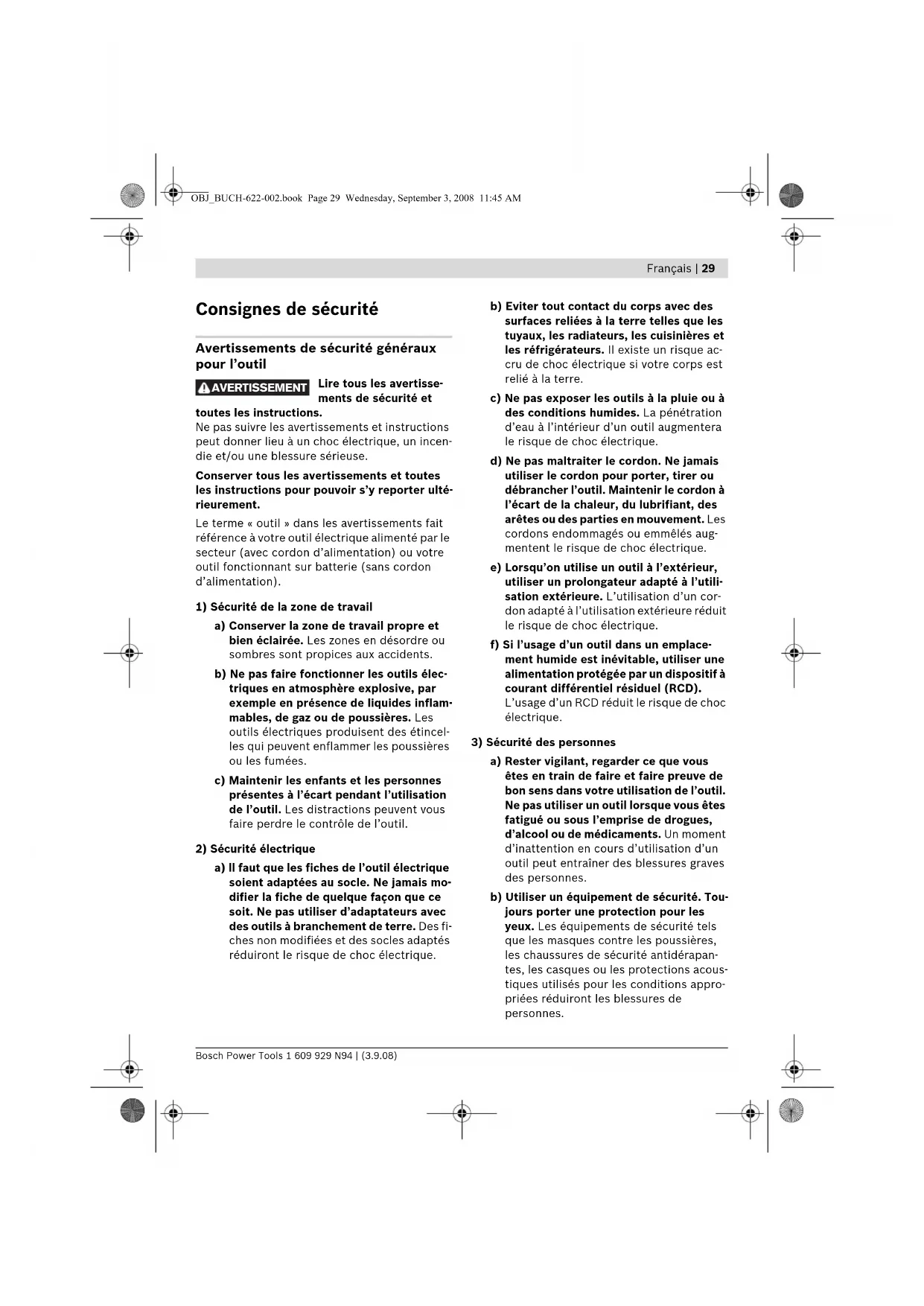 a) Rester vigilant, regarder ce que vous êtes en train de faire et faire preuve de bon sens dans votre utilisation de l’outil. Ne pas utiliser un outil lorsque vous êtes fatigué ou sous l’emprise de drogues, d’alcool ou de médicaments. Un moment d’inattention en cours d’utilisation d’un outil peut entraîner des blessures graves des personnes. b) Utiliser un équipement de sécurité. Tou- jours porter une protection pour les yeux. Les équipements de sécurité tels que les masques contre les poussières, les chaussures de sécurité antidérapan- tes, les casques ou les protections acous- tiques utilisés pour les conditions appro- priées réduiront les blessures de personnes. AVERTISSEMENT OBJ_BUCH-622-002.book Page 29 Wednesday, September 3, 2008 11:45 AM30 | Français 1 609 929 N94 | (3.9.08) Bosch Power Tools c) Eviter tout démarrage intempestif. S’as- surer que l’interrupteur est en position arrêt avant de brancher l’outil au secteur et/ou au bloc de batteries, de le ramas- ser ou de le porter. Porter les outils en ayant le doigt sur l’interrupteur ou bran- cher des outils dont l’interrupteur est en position marche est source d’accidents. d) Retirer toute clé de réglage avant de mettre l’outil en marche. Une clé laissée fixée sur une partie tournante de l’outil peut donner lieu à des blessures de per- sonnes. e) Ne pas se précipiter. Garder une posi- tion et un équilibre adaptés à tout mo- ment. Cela permet un meilleur contrôle de l’outil dans des situations inattendues. f) S’habiller de manière adaptée. Ne pas porter de vêtements amples ou de bi- joux. Garder les cheveux, les vêtements et les gants à distance des parties en mouvement. Des vêtements amples, des bijoux ou les cheveux longs peuvent être pris dans des parties en mouvement. g) Si des dispositifs sont fournis pour le raccordement d’équipements pour l’ex- traction et la récupération des poussiè- res, s’assurer qu’ils sont connectés et correctement utilisés. Utiliser des collec- teurs de poussière peut réduire les ris- ques dus aux poussières.