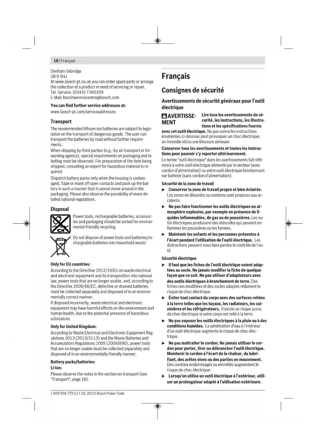 Le niveau de vibration et la valeur d’émission sonore indi- qués dans cette notice d’utilisation ont été mesurés selon une procédure de mesure normalisée et peuvent être utilisés pour établir une comparaison entre différents outils électro- portatifs. Ils peuvent aussi servir de base à une estimation préliminaire du taux de vibration et du niveau sonore. Le niveau de vibration et la valeur d’émission sonore indi- qués s’appliquent pour les utilisations principales de l’outil électroportatif. Si l’outil électroportatif est utilisé pour d’autres applications, avec d’autres accessoires de travail ou sans avoir fait l’objet d’un entretien régulier, le niveau de vi- bration et la valeur d’émission sonore peuvent différer. Il peut en résulter des vibrations et un niveau sonore nette- ment plus élevés pendant toute la durée de travail. Pour une estimation précise du niveau de vibration et du ni- veau sonore, il faut aussi prendre en considération les pé- riodes pendant lesquelles l’outil est éteint ou bien en marche sans être vraiment en action. Il peut en résulter au final un ni- veau de vibration et un niveau sonore nettement plus faibles pendant toute la durée de travail. Prévoyez des mesures de protection supplémentaires per- mettant de protéger l’utilisateur de l’effet des vibrations, par exemple : maintenance de l’outil électroportatif et des acces- soires de travail, maintien des mains au chaud, organisation des procédures de travail. Montage u Retirez l’accu de l’appareil électroportatif avant toute intervention (opérations d’entretien/de maintenance, changement d’accessoire, etc.) ainsi que lors de son transport et rangement. Il y a sinon risque de blessure lorsqu’on appuie par mégarde sur l’interrupteur Marche/ Arrêt. Bosch Power Tools 1 609 92A 7T9 | (17.05.2022)22 | Français Recharge de l’accu (voirfigureA) u N’utilisez que les chargeurs indiqués dans les Caracté- ristiques techniques. Seuls ces chargeurs sont adaptés à l’accu Lithium-Ion de votre outil électroportatif. Remarque: L’accu est fourni partiellement chargé. Pour ob- tenir les performances maximales, chargez l’accu jusqu’à sa pleine capacité avant la première utilisation. L’accu Lithium-Ion peut être rechargé à tout moment, sans risquer de réduire sa durée de vie. Le fait d’interrompre le processus de charge n’endommage pas l’accu. L’accu Lithium-Ion est protégé contre une décharge com- plète par «Electronic Cell Protection (ECP)» (l’électronique de protection des cellules). Lorsque l’accu est déchargé, l’outil électroportatif s’arrête grâce à un dispositif d’arrêt de protection: l’accessoire de travail ne tourne plus. u Après l’arrêt automatique de l’outil électroportatif, n’appuyez plus sur l’interrupteur Marche/Arrêt. L’accu pourrait être endommagé. Pour retirer l’accu (7), appuyez sur le bouton de déver- rouillage (8) et sortez l’accu par le bas. Ne forcez pas. La clé mâle pour vis à six pans creux (12) requise pour chan- ger le fer de rabot se trouve à l’intérieur de l’outil électropor- tatif. Nous recommandons que toujours la ranger à cet en- droit (voir figure A). Respectez les indications concernant l’élimination. Indicateur de niveau de charge de l’accu Les LED vertes de l'indicateur d'état de charge indiquent le niveau de charge de la batterie. Pour des raisons de sécuri- té, il n’est possible d’afficher l’état de charge que quand l’ou- til électroportatif est à l’arrêt. Pour afficher le niveau de charge, appuyez sur le bouton de l'indicateur de niveau de charge ou . L’affichage du ni- veau de charge est également possible après retrait de l’ac- cu. Si aucune LED ne s'allume après avoir appuyé sur le bouton de l'indicateur de niveau de charge, la batterie est défec- tueuse et doit être remplacée. Batterie de type GBA 18V... LED Capacité 3 LED allumées en vert 60–100% 2 LED allumées en vert 30–60% 1 LED allumée en vert 5–30% Clignotement en vert d'1 LED 0–5% Batterie de type ProCORE18V... LED Capacité 5 LED allumées en vert 80−100 % LED Capacité 4 LED allumées en vert 60−80 % 3 LED allumées en vert 40−60 % 2 LED allumées en vert 20−40 % 1 LED allumée en vert 5−20 % Clignotement en vert d’1 LED 0−5 % Remplacement des fers de rabot u Attention lors du changement des fers de rabot. Ne touchez pas les bords tranchants des fers de rabot. Vous risqueriez de vous blesser. N’utilisez que des lames de rabot au carbure (HM/TC) d’ori- gine Bosch. Le fer de rabot au carbure (HM/TC) dispose de 2bords tran- chants et il est réversible. Lorsque les deux bords tranchants sont émoussés, le fer de rabot (16) doit être remplacé. Le fer de rabot au carbure (HM/TC) ne doit pas être réaffûté. Démontage du fer de rabot (voir figure B) Pour retourner ou remplacer le fer de rabot (16), faites tour- ner la tête porte-fer (13), jusqu’à ce qu’elle soit parallèle à la semelle (10).