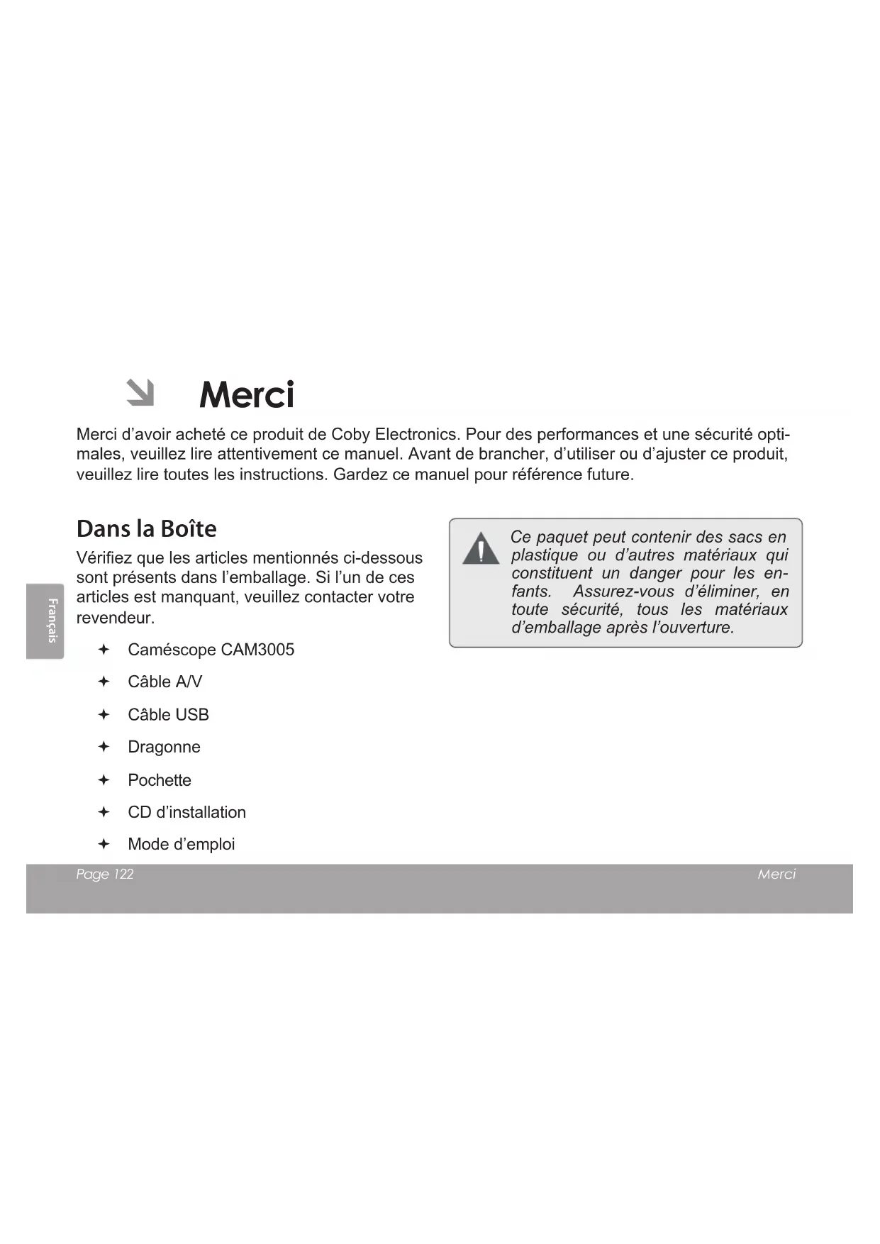 RÈGLEMENT .................................................174Français Page 122 Merci  Merci Merci d’avoir acheté ce produit de Coby Electronics. Pour des performances et une sécurité opti- males, veuillez lire attentivement ce manuel. Avant de brancher, d’utiliser ou d’ajuster ce produit, veuillez lire toutes les instructions. Gardez ce manuel pour référence future. Dans la Boîte Vériez que les articles mentionnés ci-dessous sont présents dans l’emballage. Si l’un de ces articles est manquant, veuillez contacter votre revendeur. Caméscope CAM3005 Câble A/V Câble USB Dragonne Pochette CD d’installation Mode d’emploi Ce paquet peut contenir des sacs en plastique ou d’autres matériaux qui constituent un danger pour les en- fants. Assurez-vous d’éliminer, en toute sécurité, tous les matériaux d’emballage après l’ouverture.Français Caméscope En Un Coup D’oeil Page 123  Caméscope en un Coup d’Oeil Dans cette section, vous pourrez : En savoir plus sur le caméscope et sur ce que chaque partie fait. Vue de face Part Description 1 Ecran LCD Afche l’image capturée par l’objectif ainsi que l’état du système et les menus. 2 MODE Vous pouvez basculer entre les modes Film, Photo, et Visualisation. Cambio entre los modos de MSDC y PC Cam cuando se conecta a un ordenador. 3 SET (Paramètres) Appuyez sur SET pour afch- er un menu des paramètres des options du caméscope.Français Page 124 Caméscope En Un Coup D’oeil Part Description 4 T (Té- léscopique) Vous pouvez effectuer un zoom pendant le tournage d’un lm ou pendant une photo. 5 GAUCHE Vous pouvez choisir la qualité d’enregistrement pendant le tournage d’un lm ou pendant une photo. 6 OK Vous pouvez appuyer des- sus pour démarrer ou arrêter l’enregistrement. 7 DROITE Vous pouvez choisir la qualité d’enregistrement pendant le tournage d’un lm ou pendant une photo. 8 W (Large) Vous pouvez effectuer un zoom arrière pendant le tournage d’un lm ou pendant une photo.Français Caméscope En Un Coup D’oeil Page 125 Vue Arrière Part 9 Prise USB Branchez à un ordinateur pour transférer des chiers à partir du caméscope. 10 Relâche de prise USB Faites glisser vers le bas pour relâcher la prise USB. 11 Haut-parleur Fournit le son lors de la visualisa- tion des lms sur le caméscope. 12 Objectif Pointez l’objectif vers le sujet que vous voulez enregistrer. Evitez de toucher ou de rayer la surface de l’objectif. 13 Micro Enregistre le son. Évitez de couvrir le micro pendant le tournage d’un lm avec le caméscope. 14 Sortie A/V Utilisez avec le câble A/V inclus pour connecter le caméscope à un téléviseur ou à un autre afchage. 15 Cache du compartiment à piles Faites glisser le cache pour avoir accès au compartiment à piles.Français Page 126 Caméscope En Un Coup D’oeil Vue du Côté Gauche Part 16 MISE EN MARCHE/ ARRÊT Appuyez dessus et main- tenez ce bouton enfoncé pour allumer le caméscope. Appuyez dessus pour étein- dre le caméscope. 17 Fente de Carte Mémoire Chargez des cartes mémoire SD ou SDHC ici. Les con- tacts métalliques de la carte doivent faire face à la même direction que l’écran LCD (ACL). 18 Monture de drag- onne Fixez la dragonne incluse ici.FrançaisPour Démarrer Page 127 Chargement d’une Carte Mémoire Le caméscope enregistre sur des cartes mé- moires SD, SDHC ou MMC (maximum 16 GB). Chargez une carte mémoire en l’insérant dans la fente pour carte mémoire sur le côté gauche du caméscope. Assurez- vous que les contacts dorés de la carte mémoire soient face à l’écran LCD (ACL). Appuyez sur la carte mémoire pour la faire rentrer dans la fente jusqu’à ce qu’elle s’enclenche en place. Pour retirer la carte mémoire, appuyez davan- tage sur la fente, puis relâchez. La carte sortira de la fente. Pour éviter la corruption de données, éteignez le caméscope avant d’insérer ou de retirer une carte mémoire. N’essayez pas de placer un objet autre qu’une carte mémoire compatible dans la fente de carte mémoire. Une carte mé- moire compatible devrait se glisser facile- ment dans la fente de carte mémoire. Si vous rencontrez une résistance, n’essayez pas de forcer la carte à rentrer. Evitez de toucher les contacts en métal de la carte mémoire.  Pour Démarrer Dans cette section, vous pourrez : Apprendre à choisir et à charger une carte mémoire. Apprendre à installer les piles. Apprendre à mettre le caméscope en marche. Apprendre à basculer entre les modes lm, photo, et visualisation.Français Page 128 Pour Démarrer Si votre carte mémoire dispose d’un commutateur de protection à l’écriture, assurez-vous que le commutateur est réglé sur la position “Unlock” (Déver- rouillé). Installation des Piles Le caméscope nécessite trois (3) piles de type “AAA” pour son fonctionnement.