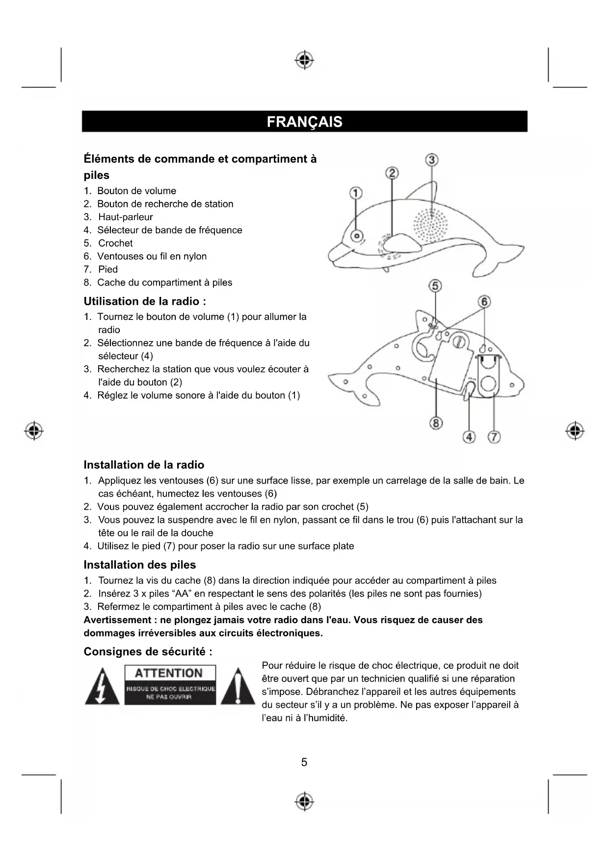 Avertissement : ne plongez jamais votre radio dans l'eau. Vous risquez de causer des
