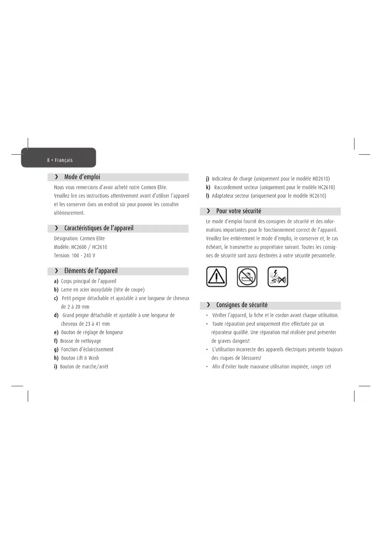Uniquement pour le modele HC2610: Cet appeareil contient une pile rechargeable NiMH. Ne pas jeter cette pile avec les déchets menagers; il convient de la déposer dans un point de collecte pour petits déchets chimiques.