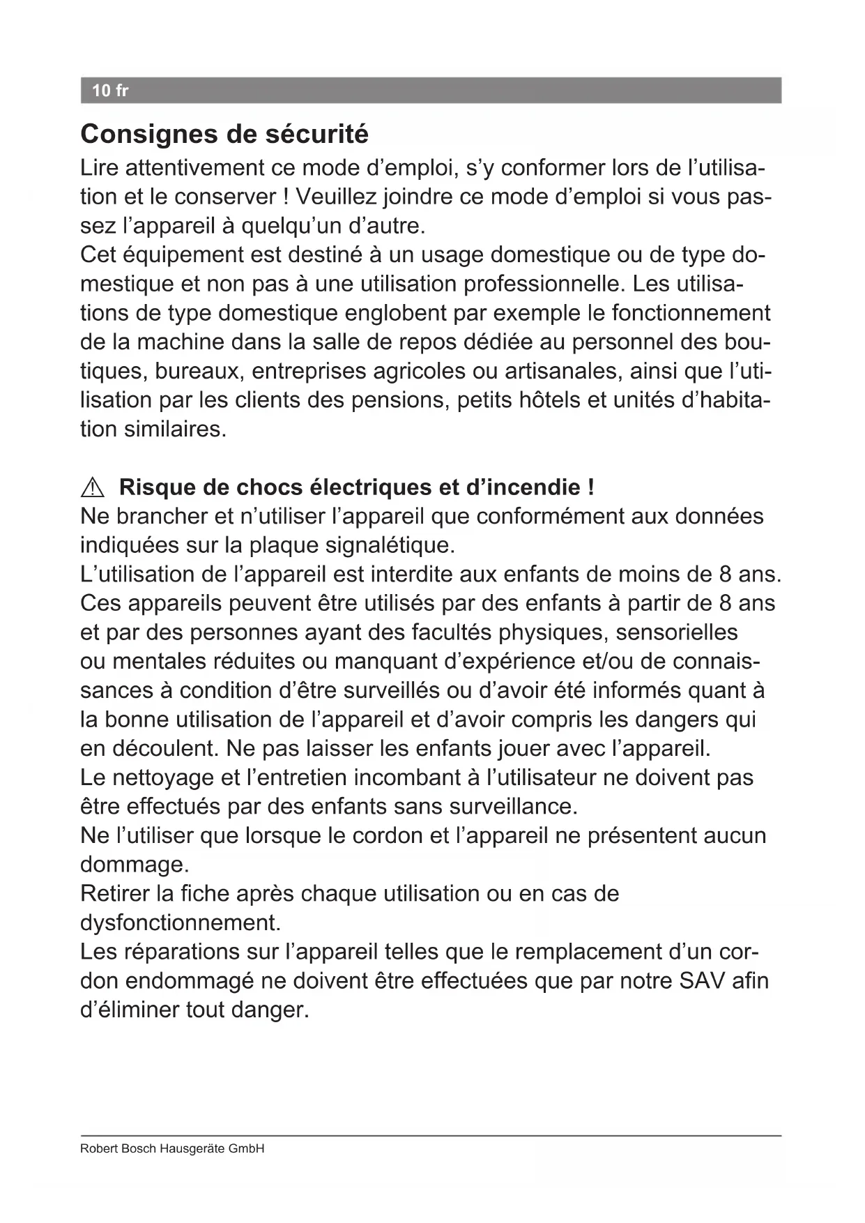 Danger de mort ! Ne jamais mettre l’appareil au contact de l’eau. Il y a également risque lorsque l’appareil est éteint. C’est la raison pour laquelle, après utilisation ou lors d’une interruption d’utilisation, il faut retirer la che. L’installation d’un interrupteur de protection contre les courants de court-circuit jusqu’à 30 mA dans la maison offre une protection supplémentaire. Se faire conseiller par un monteur en dispositifs électriques.