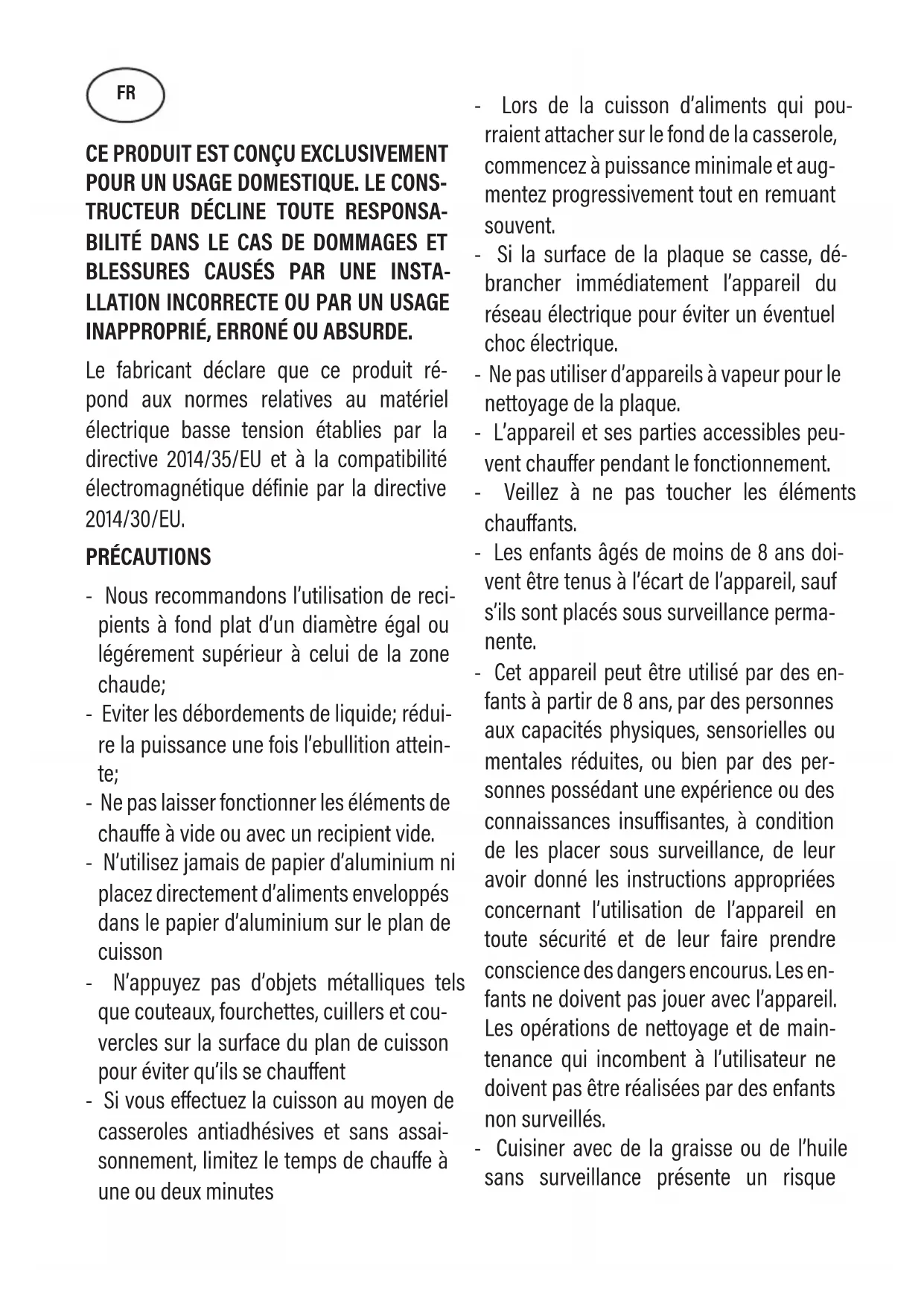 - Cet apparéil peut être utilisé par des enfants à partir de 8 ans, par des personnes aux capacités physiques, sensorielles ou mentales réduites, ou bien par des personnes possédant une expérience ou des connaissances insuffisantes, à condition de les placer sous surveillance, de leur avoir donné les instructions appropriées concernant l'utilisation de l' apparéil en toute sécurité et de leur faire prendre conscience des dangers encourus. Les enfants ne doivent pas jouer avec l' apparéil. Les opérations de nettoyage et de maintenance qui incombent à l'utilisateur ne doivent pas été réalisées par des enfants non surveillés.
